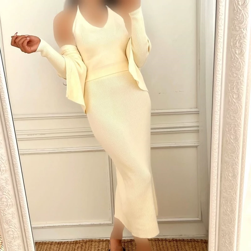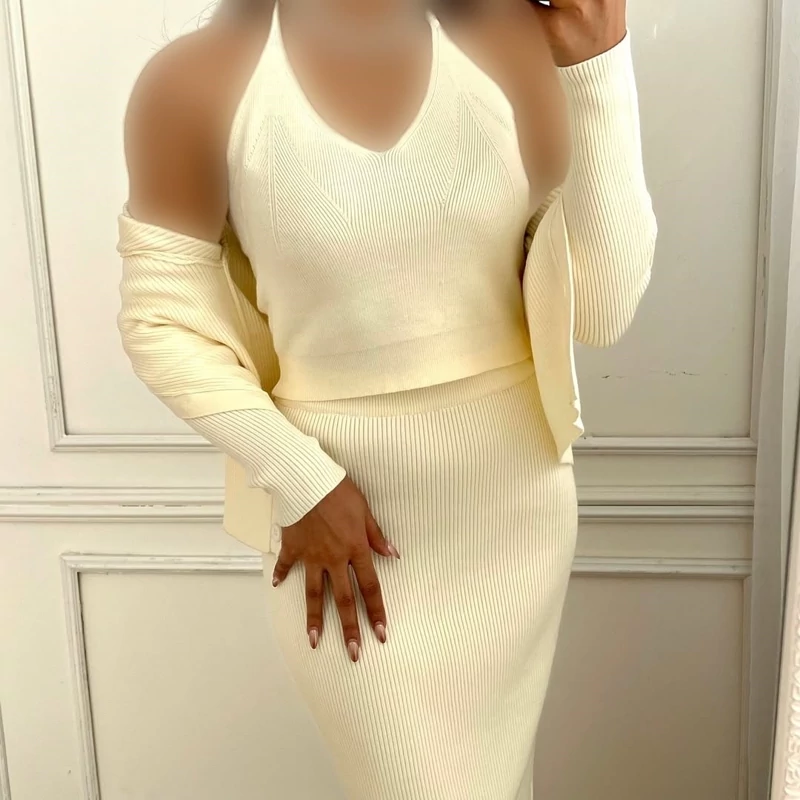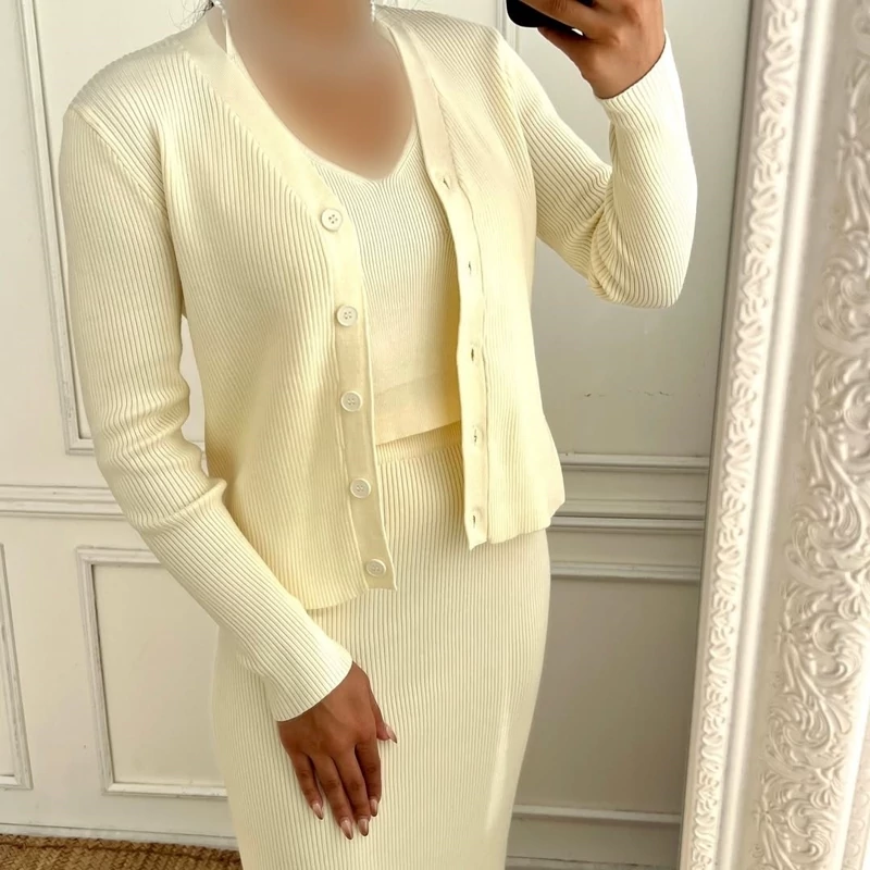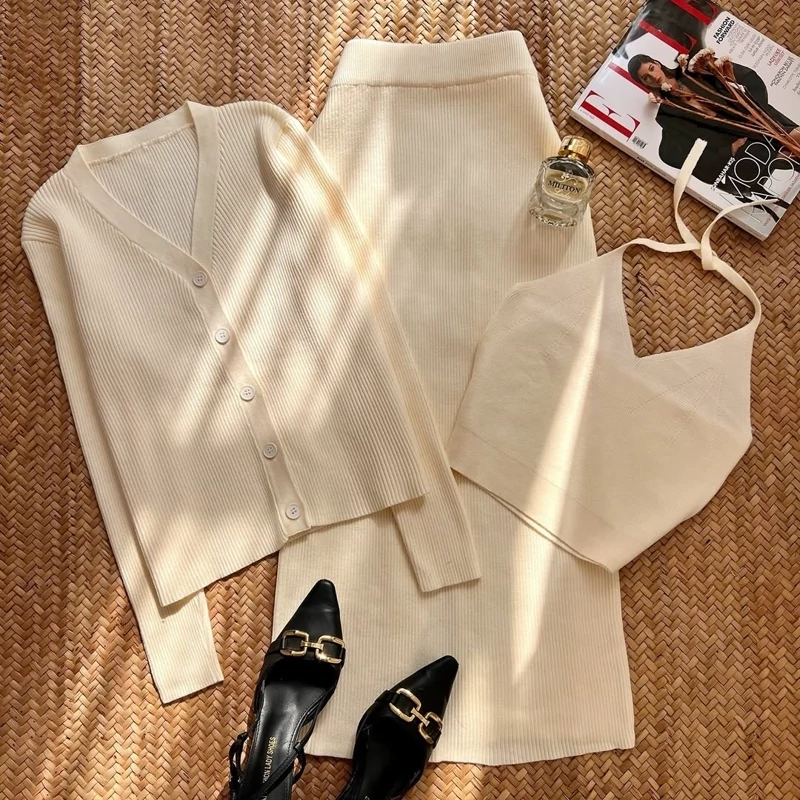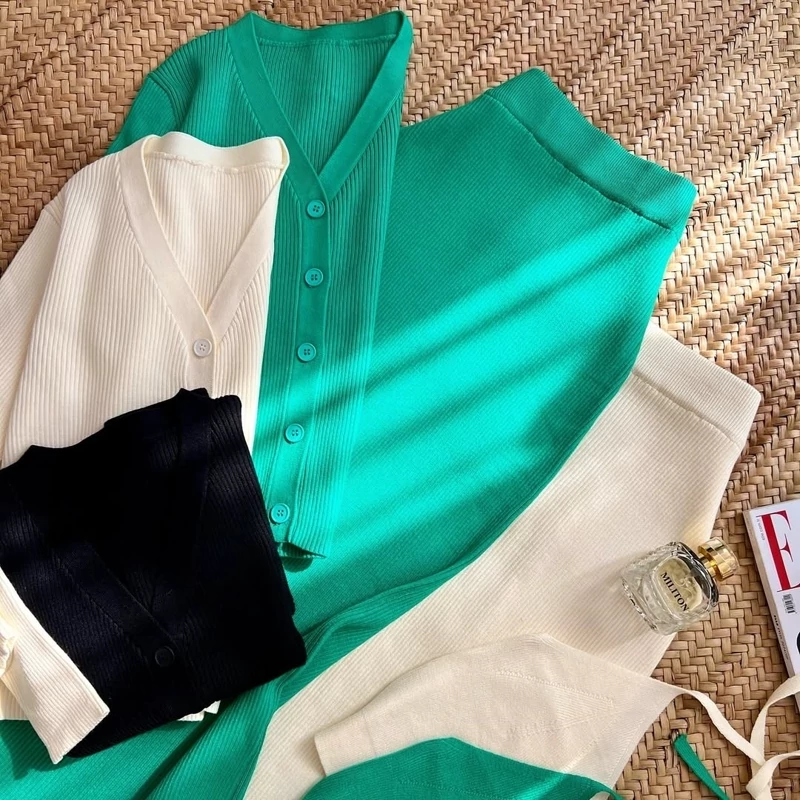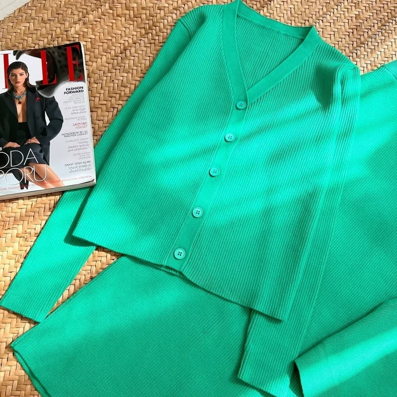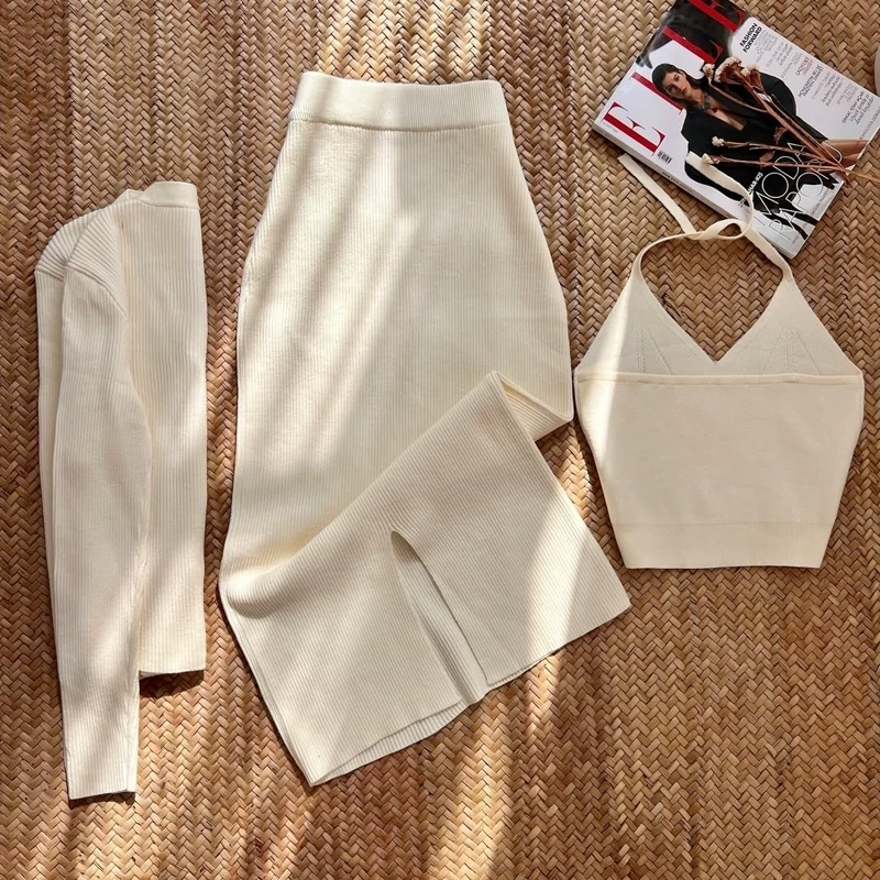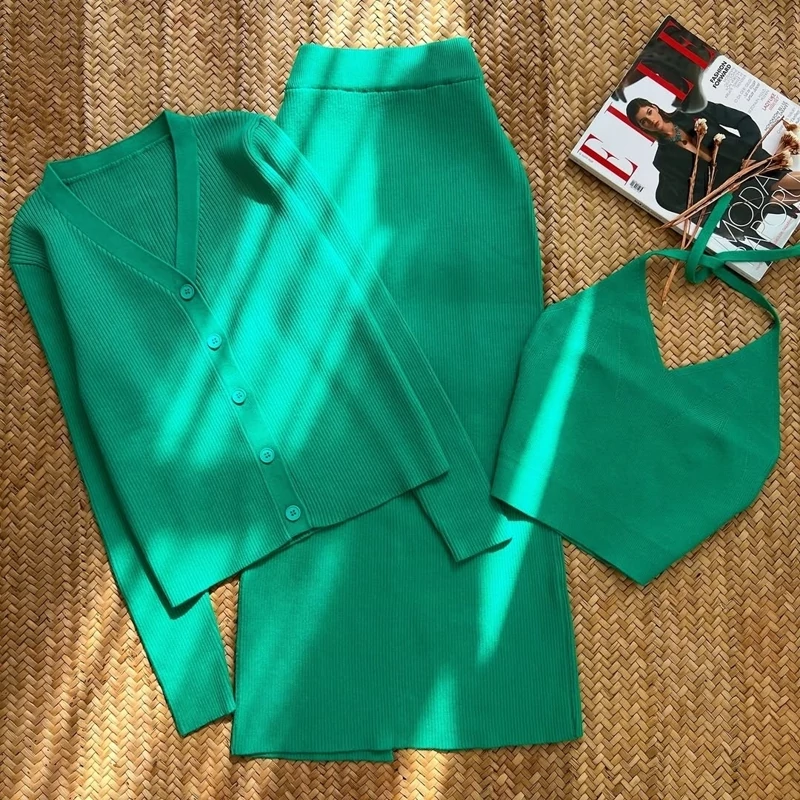 یه سه تکه خیلی خشکل و کاربردی و البته فوق العاده شیک کار وارداتی بافت گرم بالا و منسجم شامل سه تکه:تاپ،ژاکت،دامن
