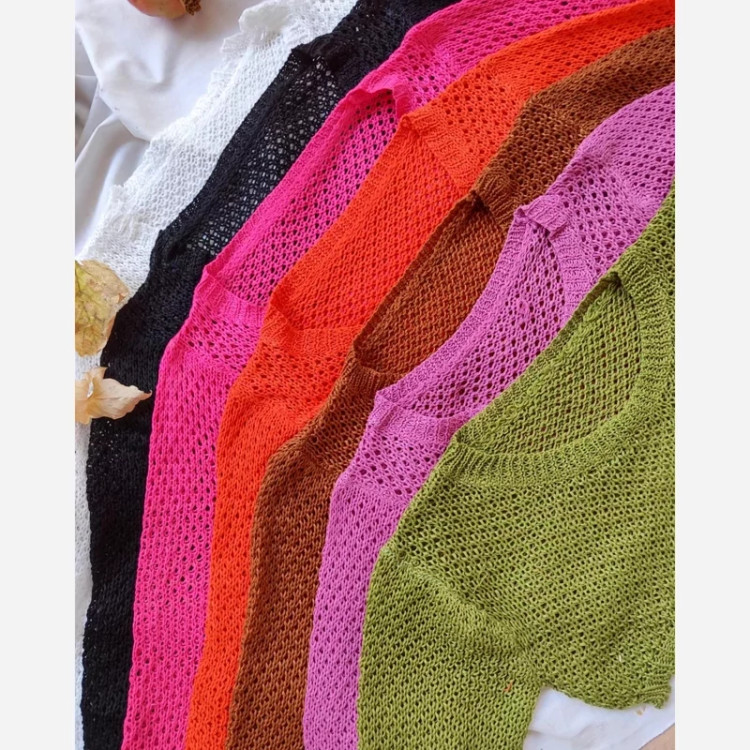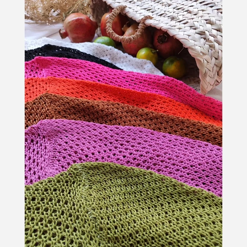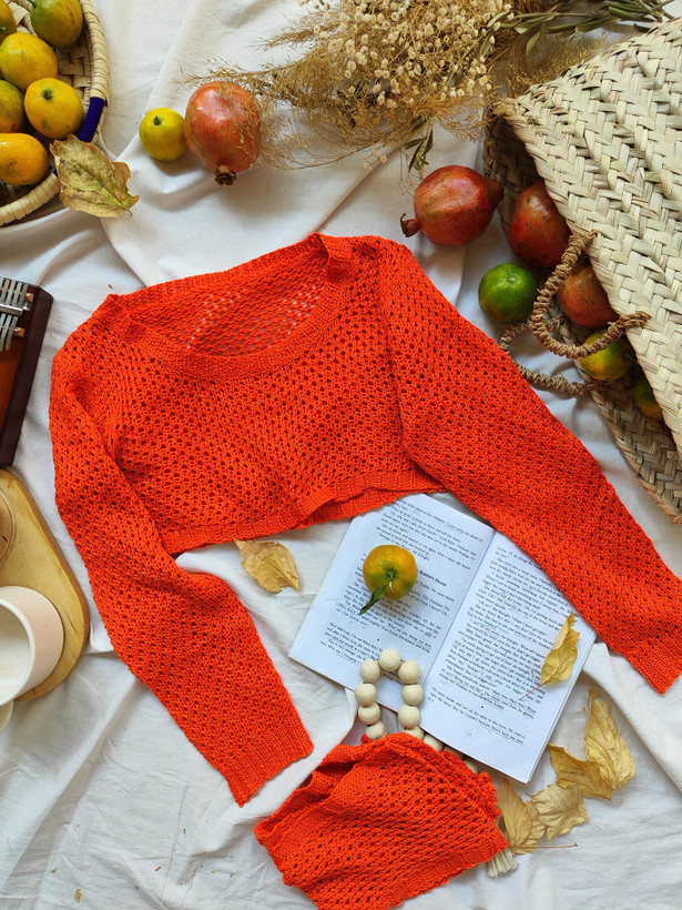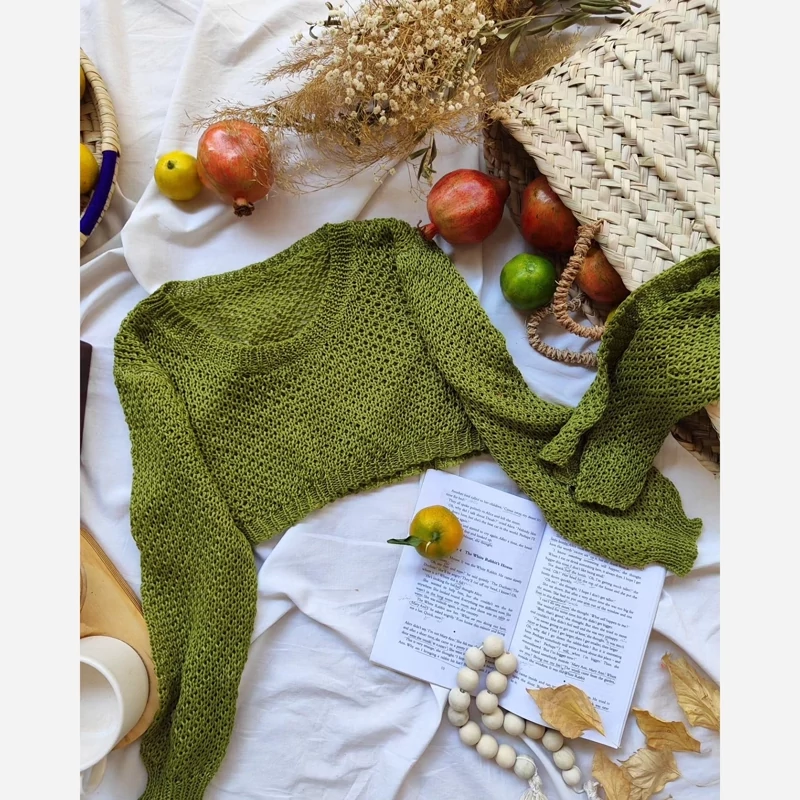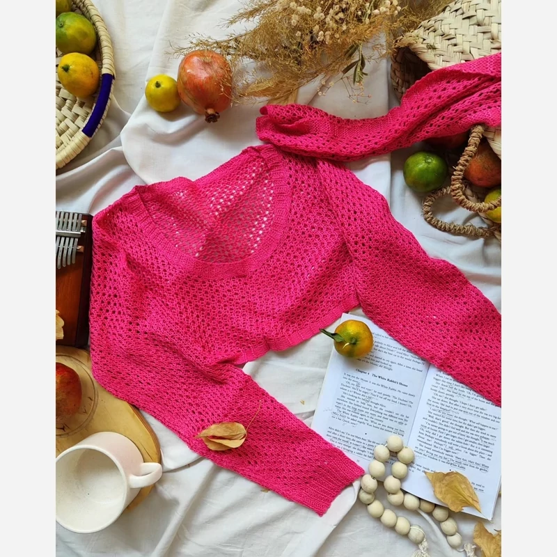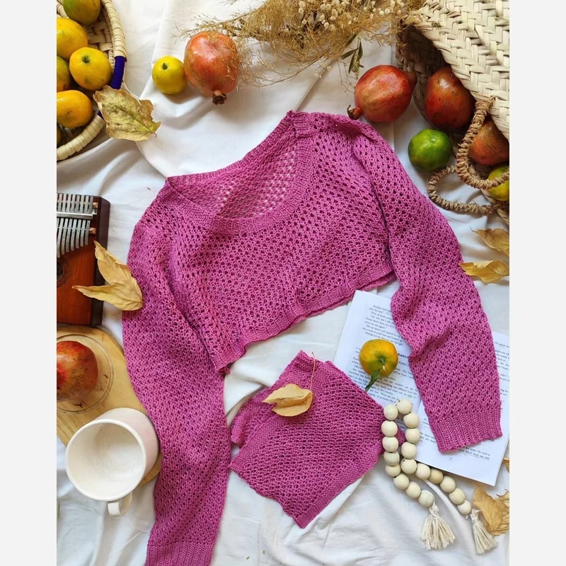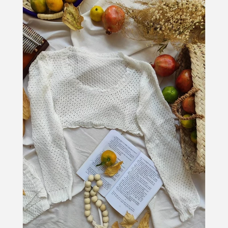این آیتم برای خوش پوش هایی که دنبال استایل متفاوت هستن بافت کاموا خیلی لطیف و ظریف قلاب بافی شده بصورت کراپ و نیم تنه ست و یه شال کوچولو داره که هم میشه دور یقه استایل کرد هم پاپیونی جلو کراپ گره کرد و هم به عنوان اکسسوری مو سایزبندی داره
