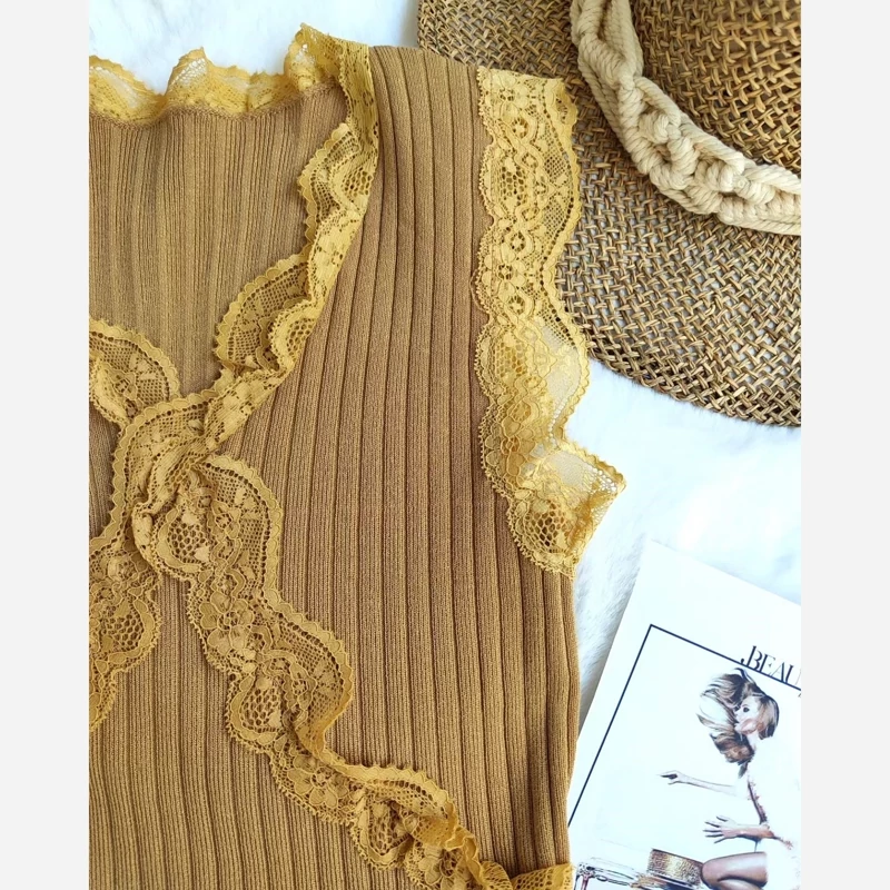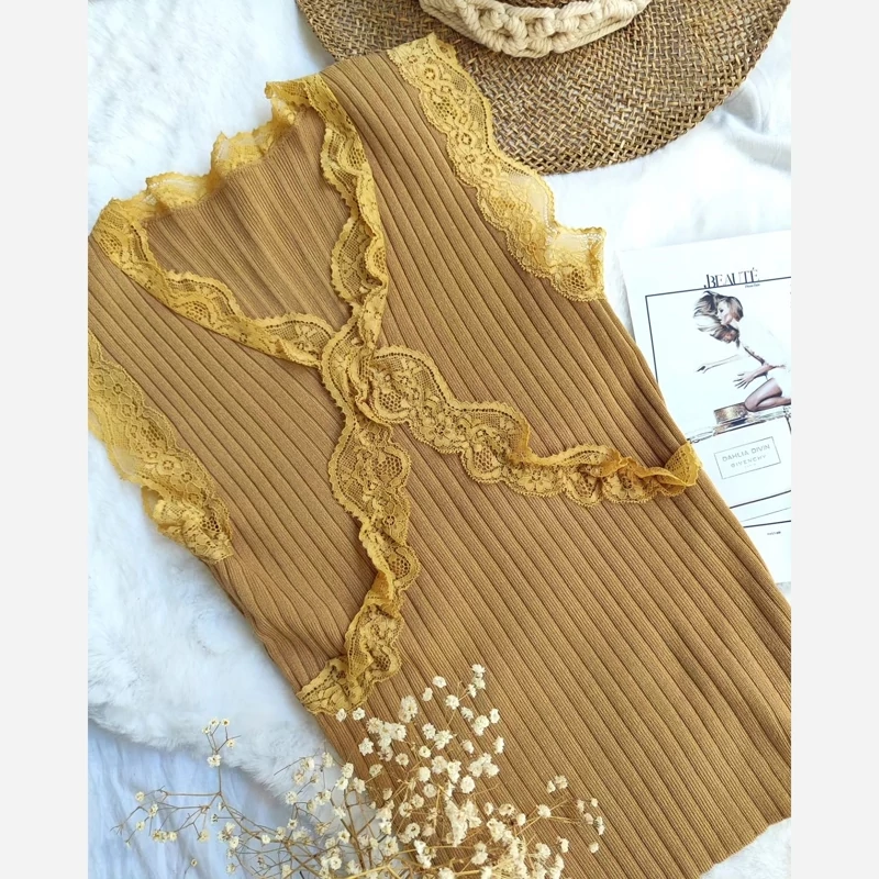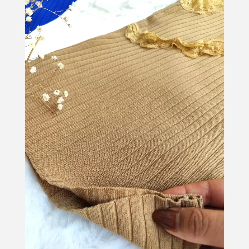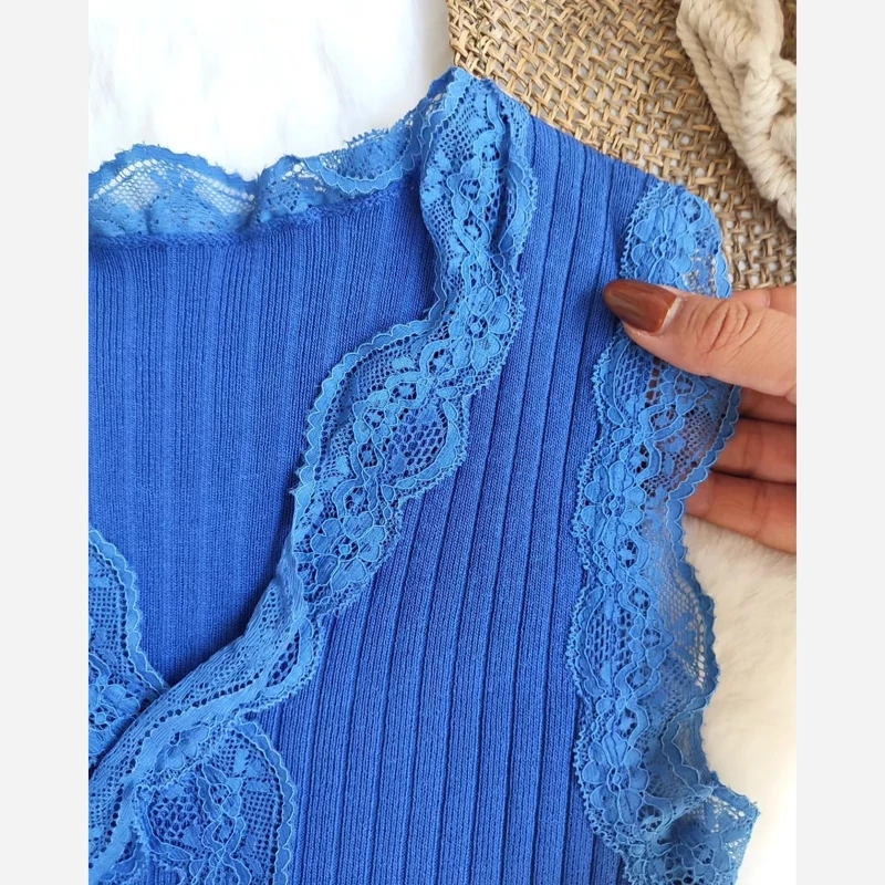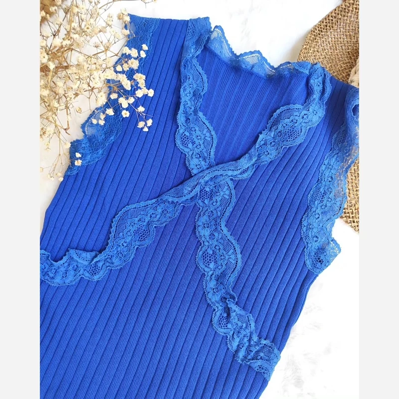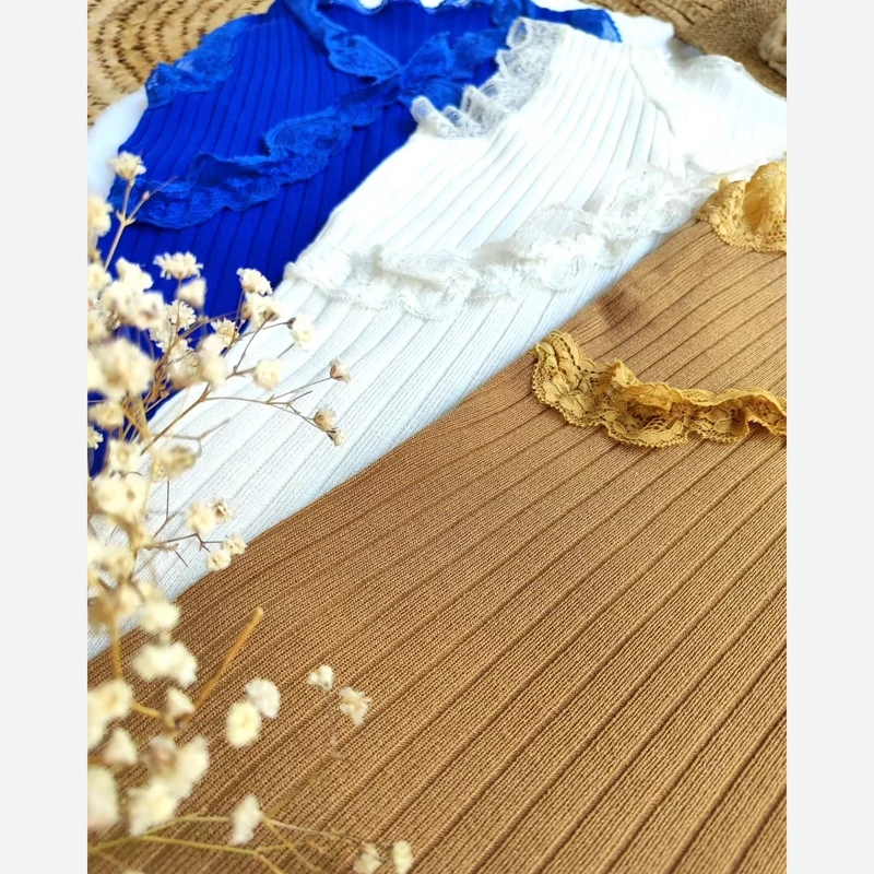تاپ بافت مدل یقه توری یه بافت سبک و راحت همراه با کشسانی بالا با تورهای قشنگی که جلو کار وحلقه آستین که زیباییش و بیشتر کرده دو رنگ آبی کاربنی و نسکافه ای روشن