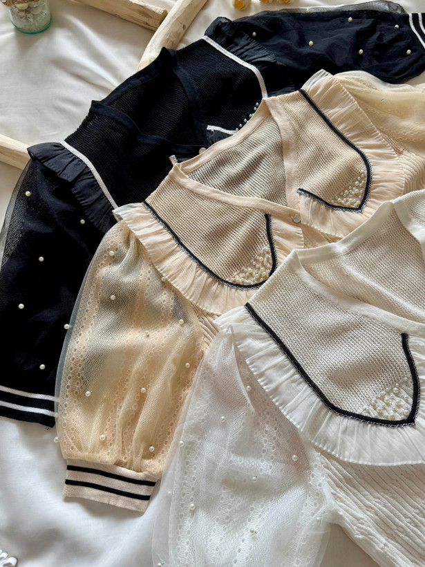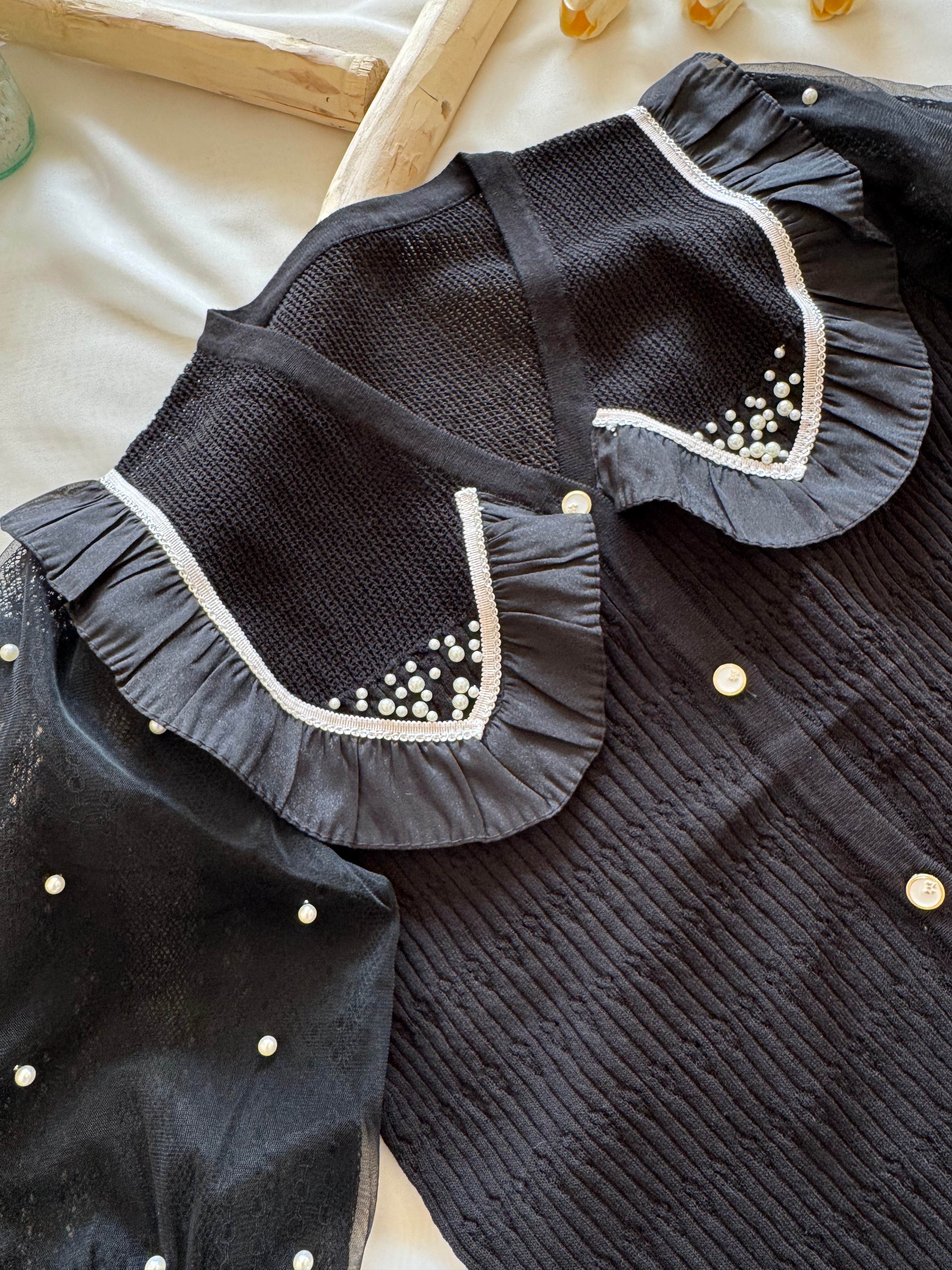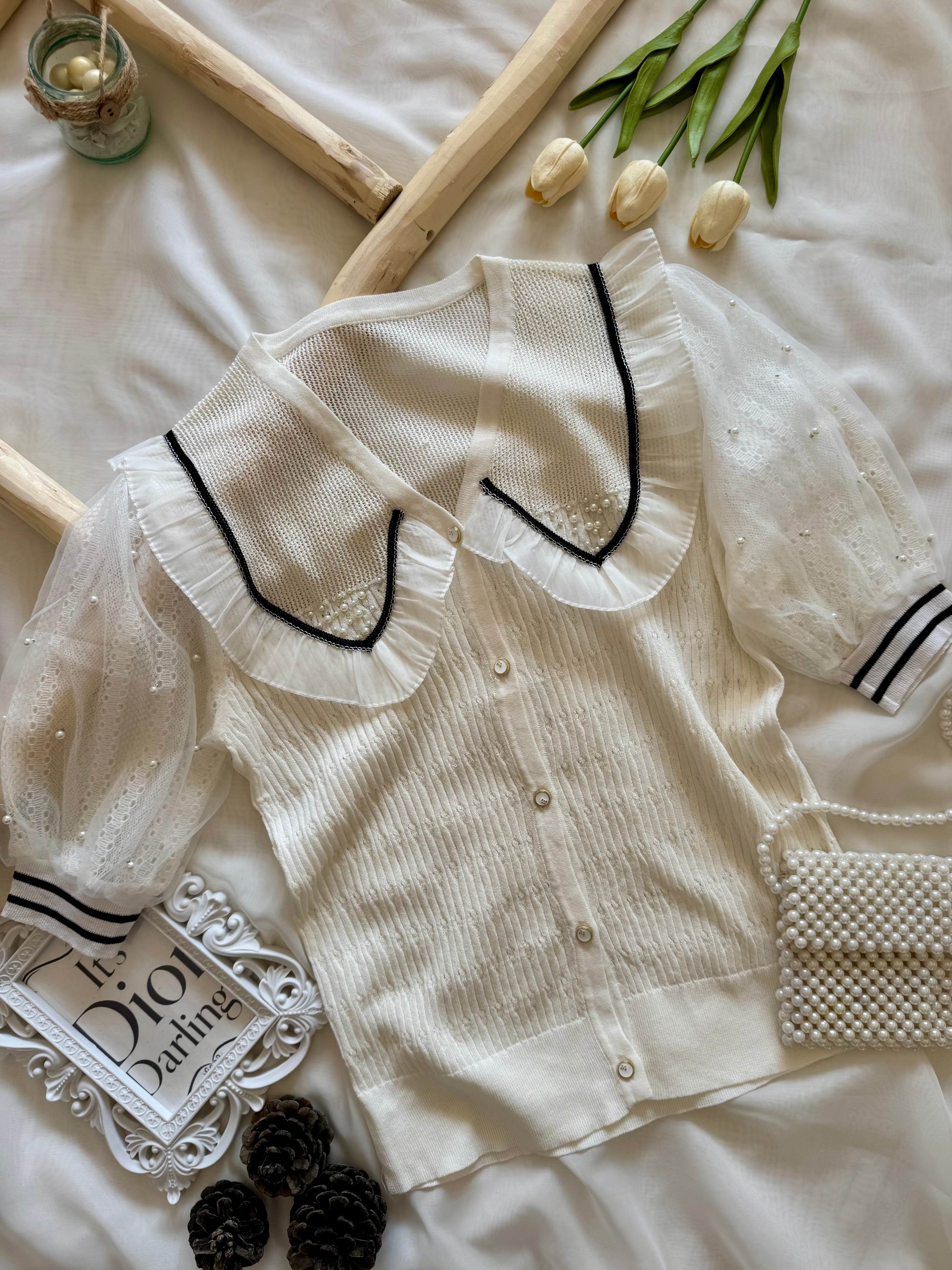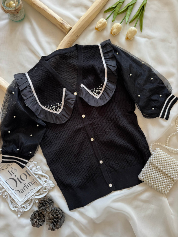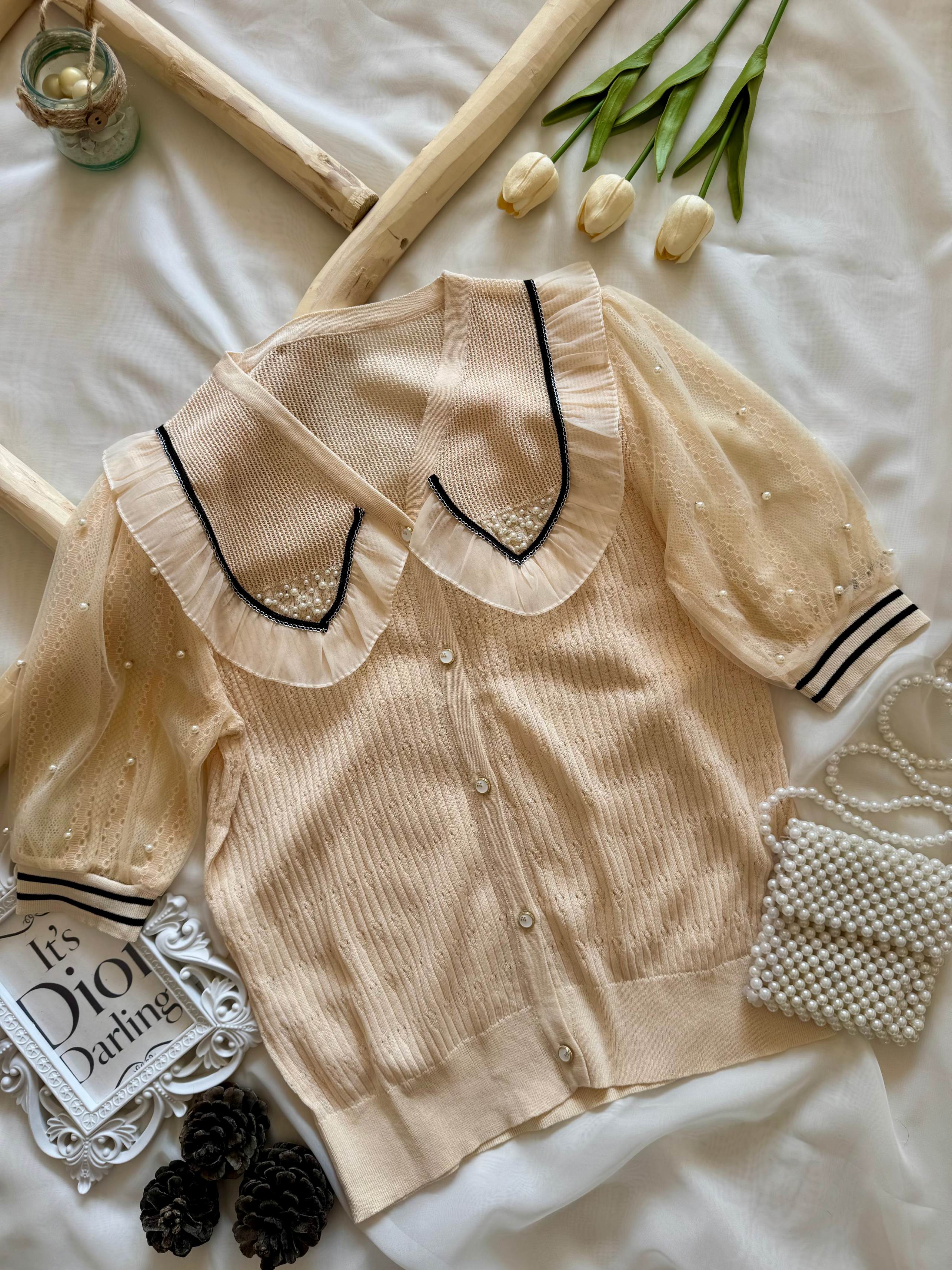بافت آستین کوتاه دو لایه با تور و حریر و مروارید های پانچ شده