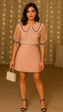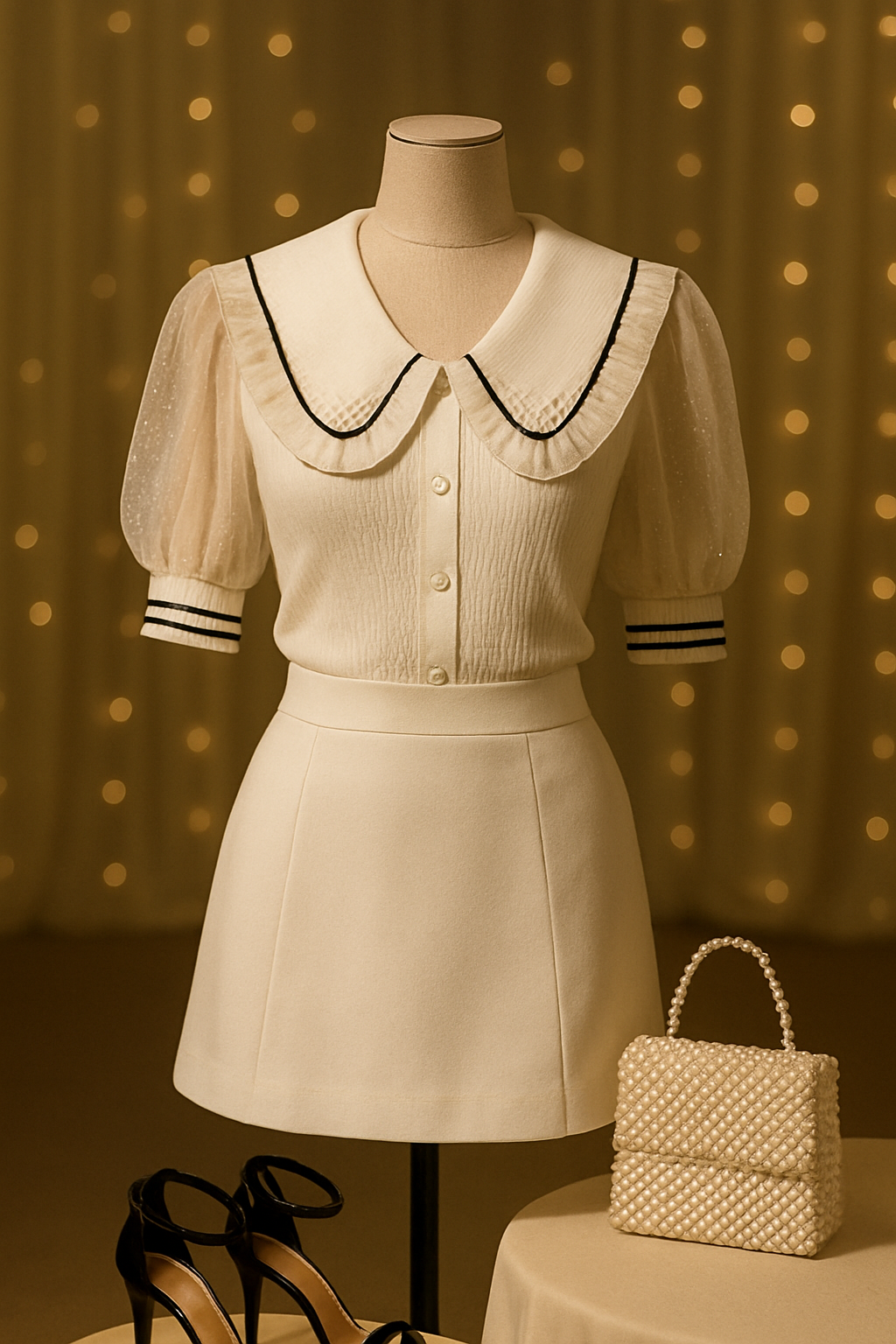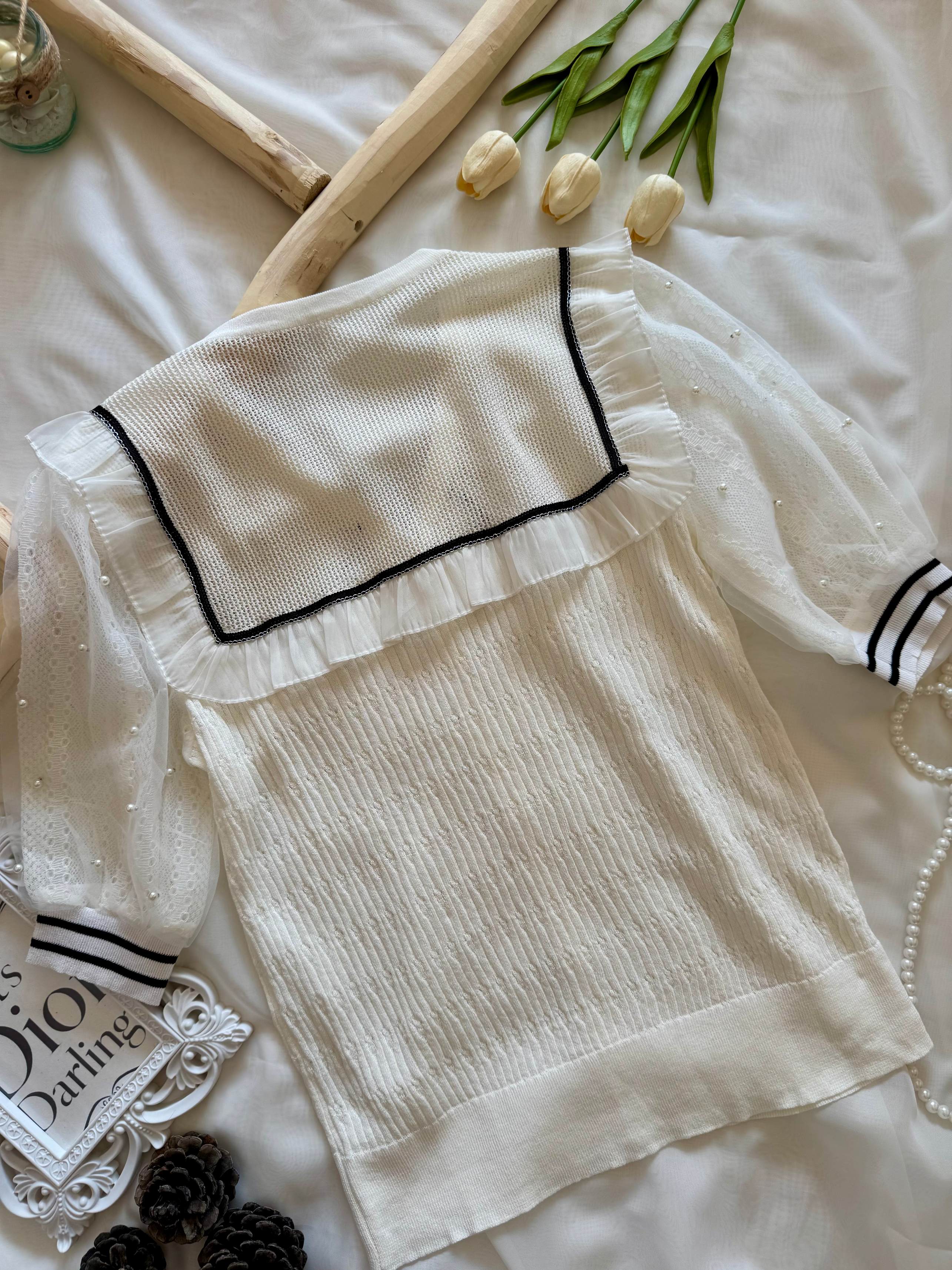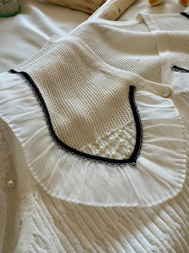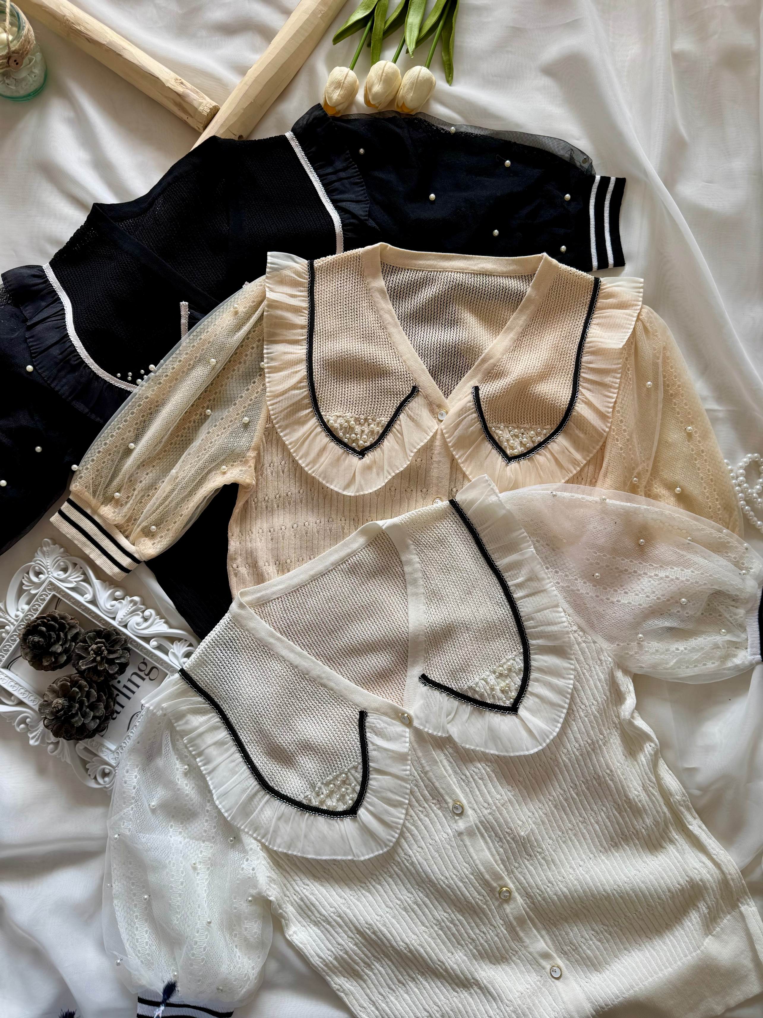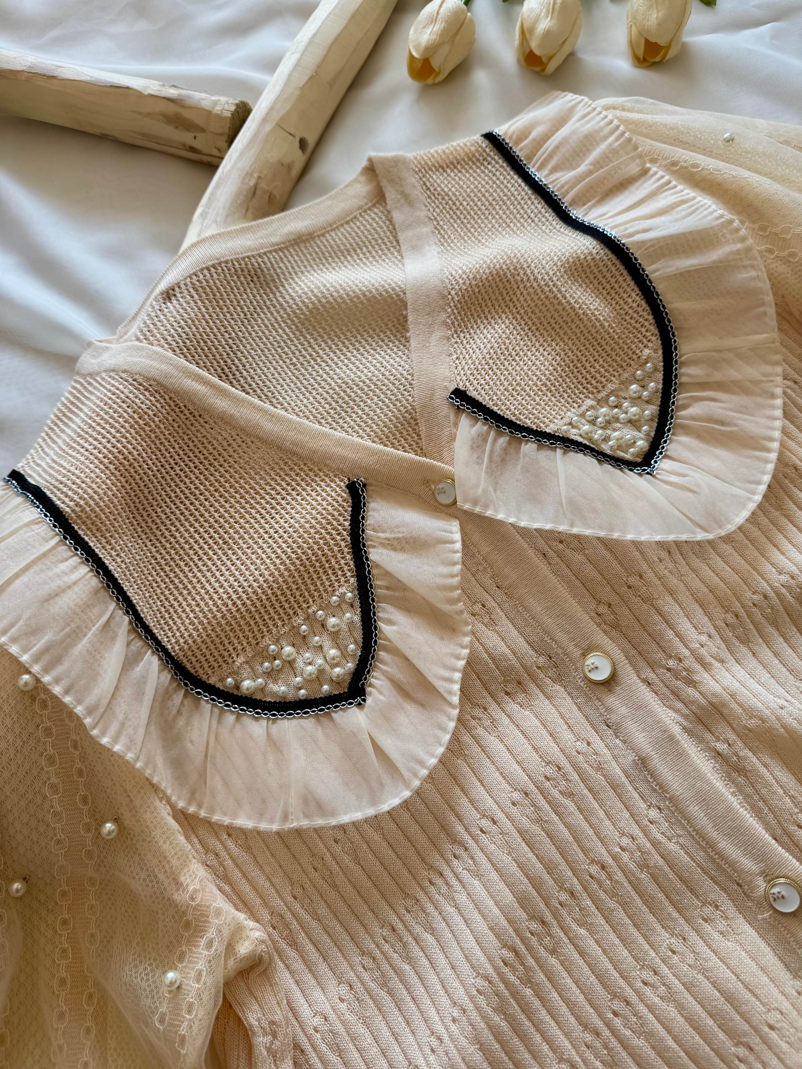 بافت آستین کوتاه دو لایه با تور و حریر و مروارید های پانچ شده