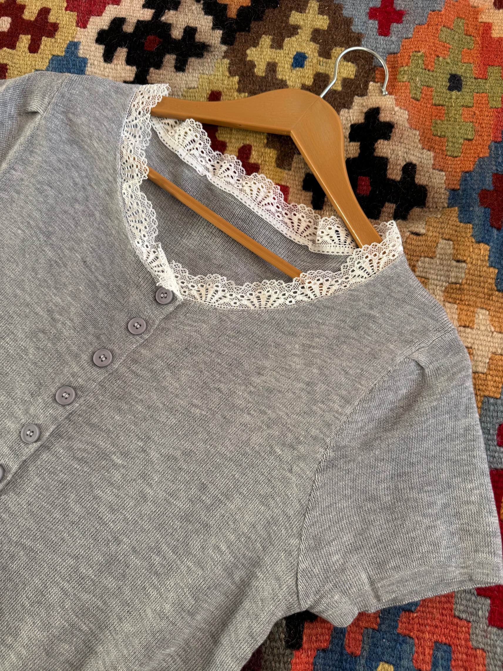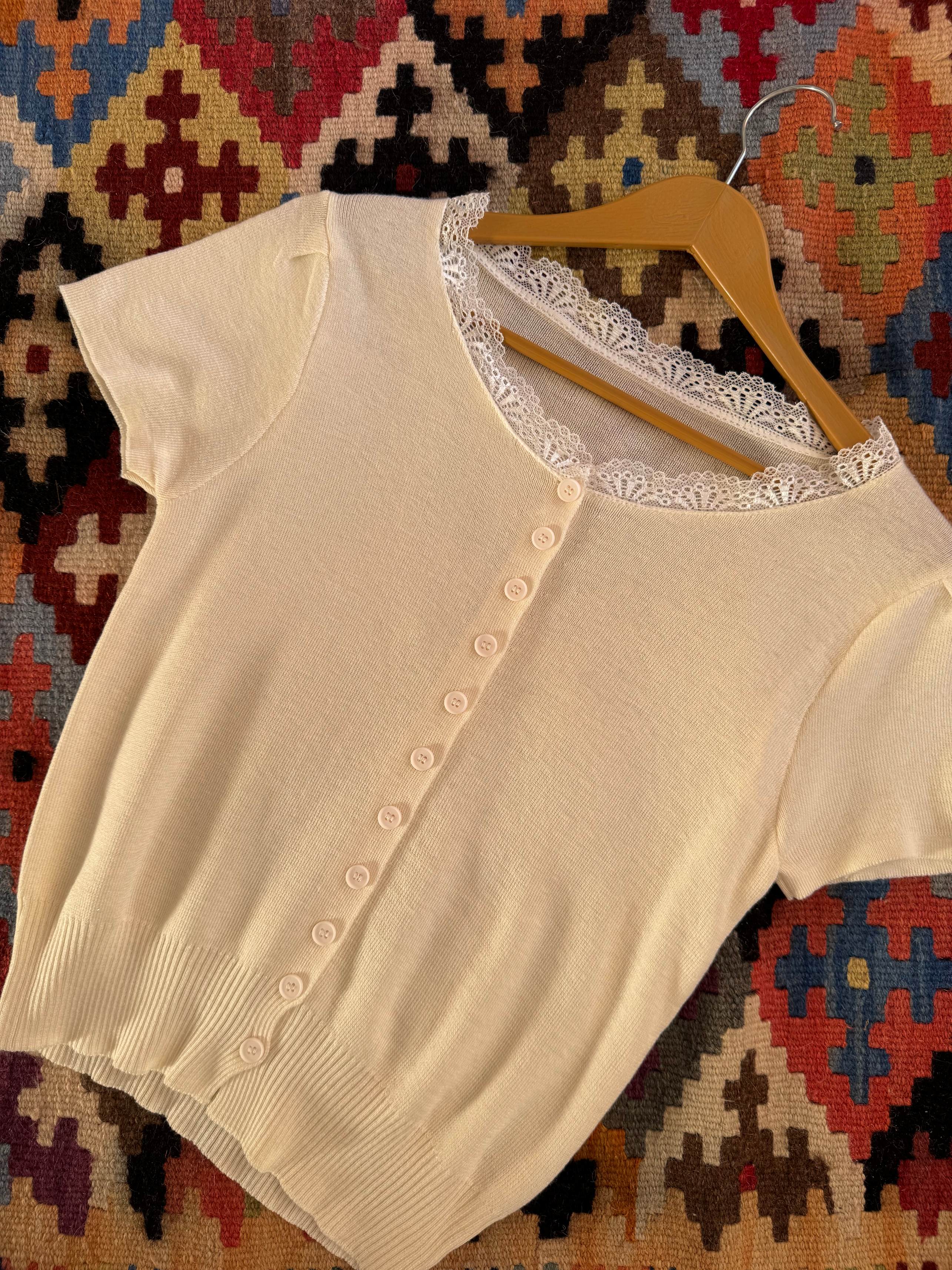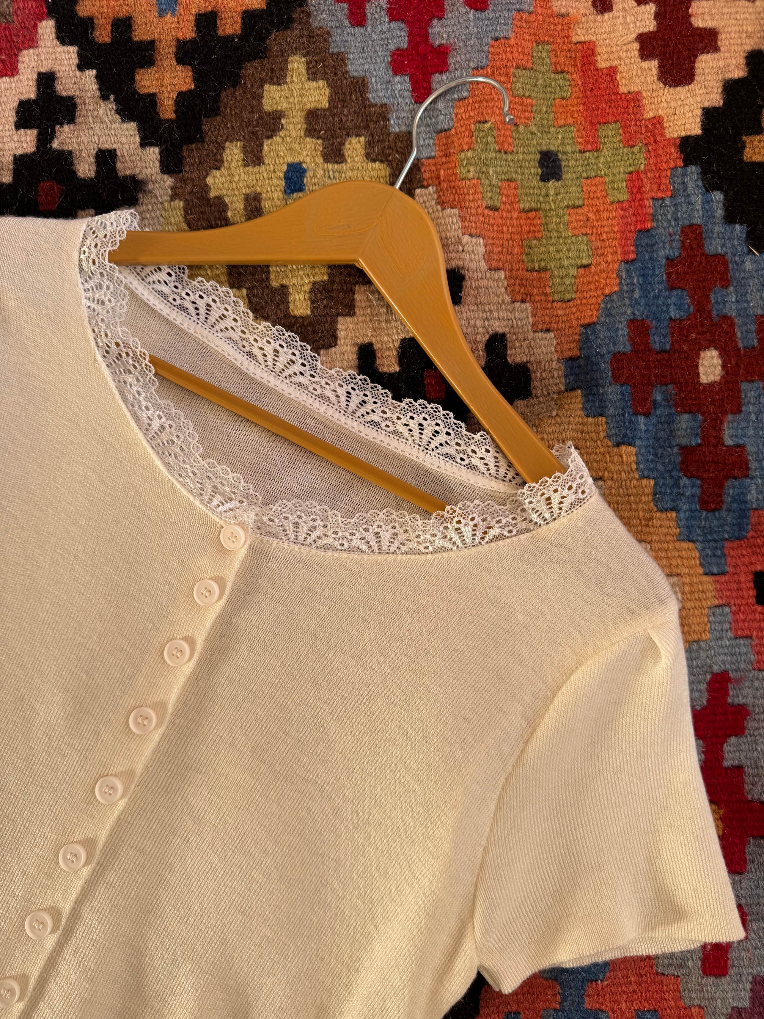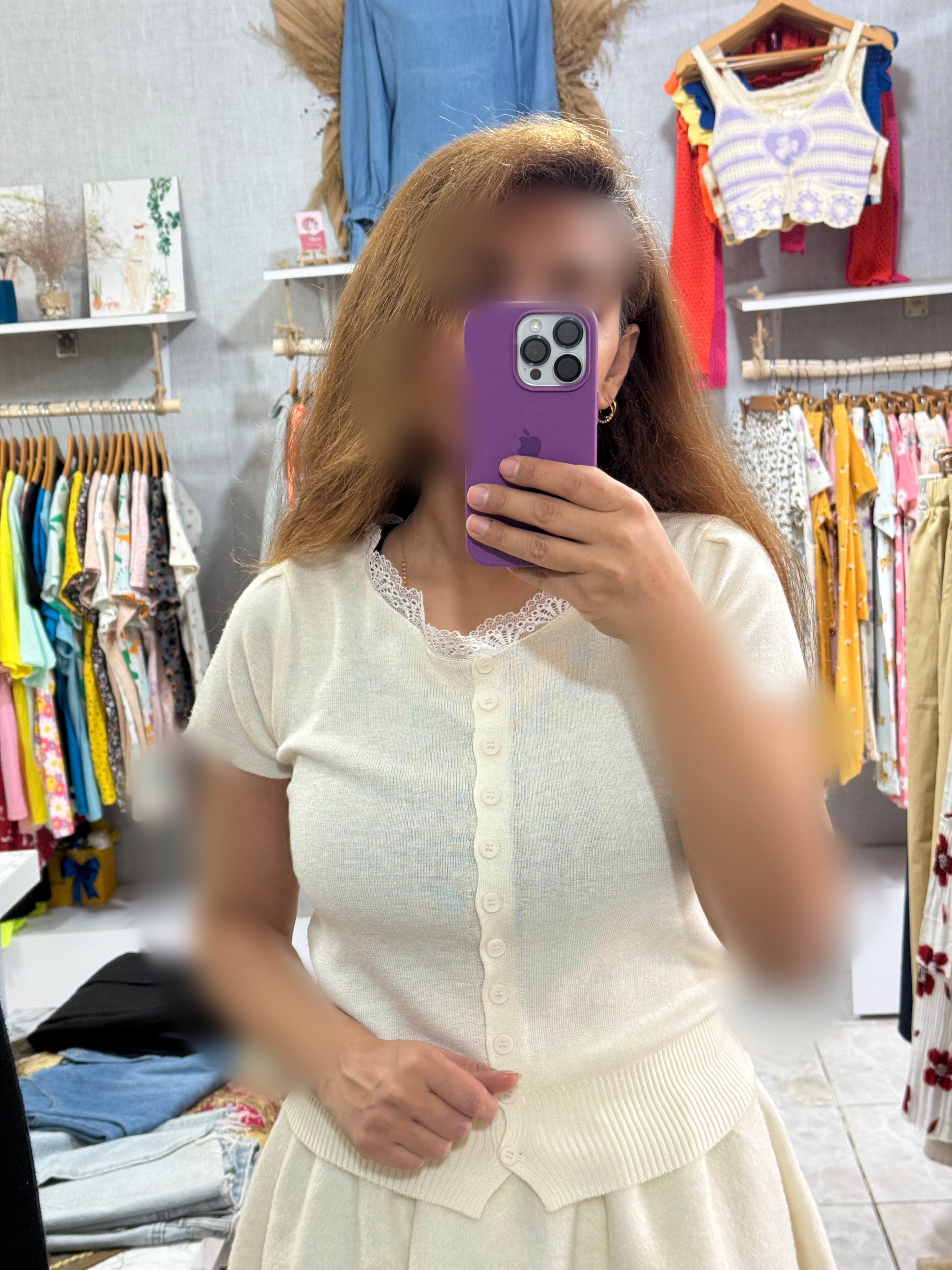 تیشرت بافت دخترانه و زنانه مدل جلو دکمه جنس کار بافت ظریف کریستال جنسش خیلی لطیف و نرمه دکمه ها باز میشن دور یقه دانتل ظریف کار شده فری سایزه و کشسانی خوبی داره فاصله دو زیر بغل ۴۹ بلندی ۵۱