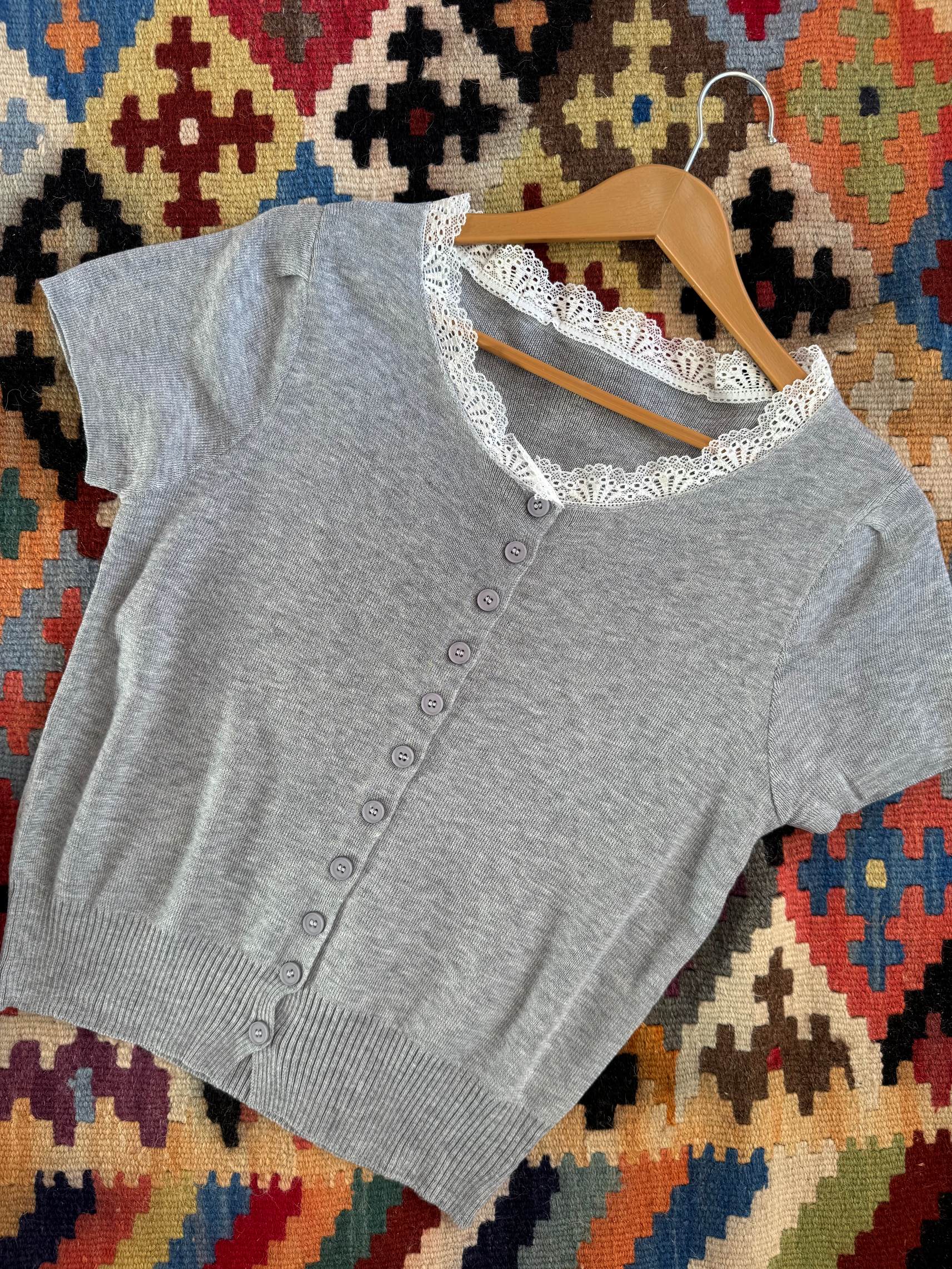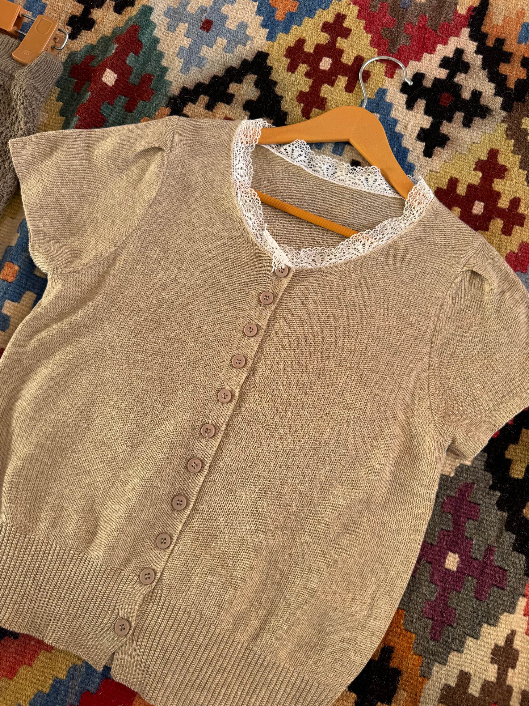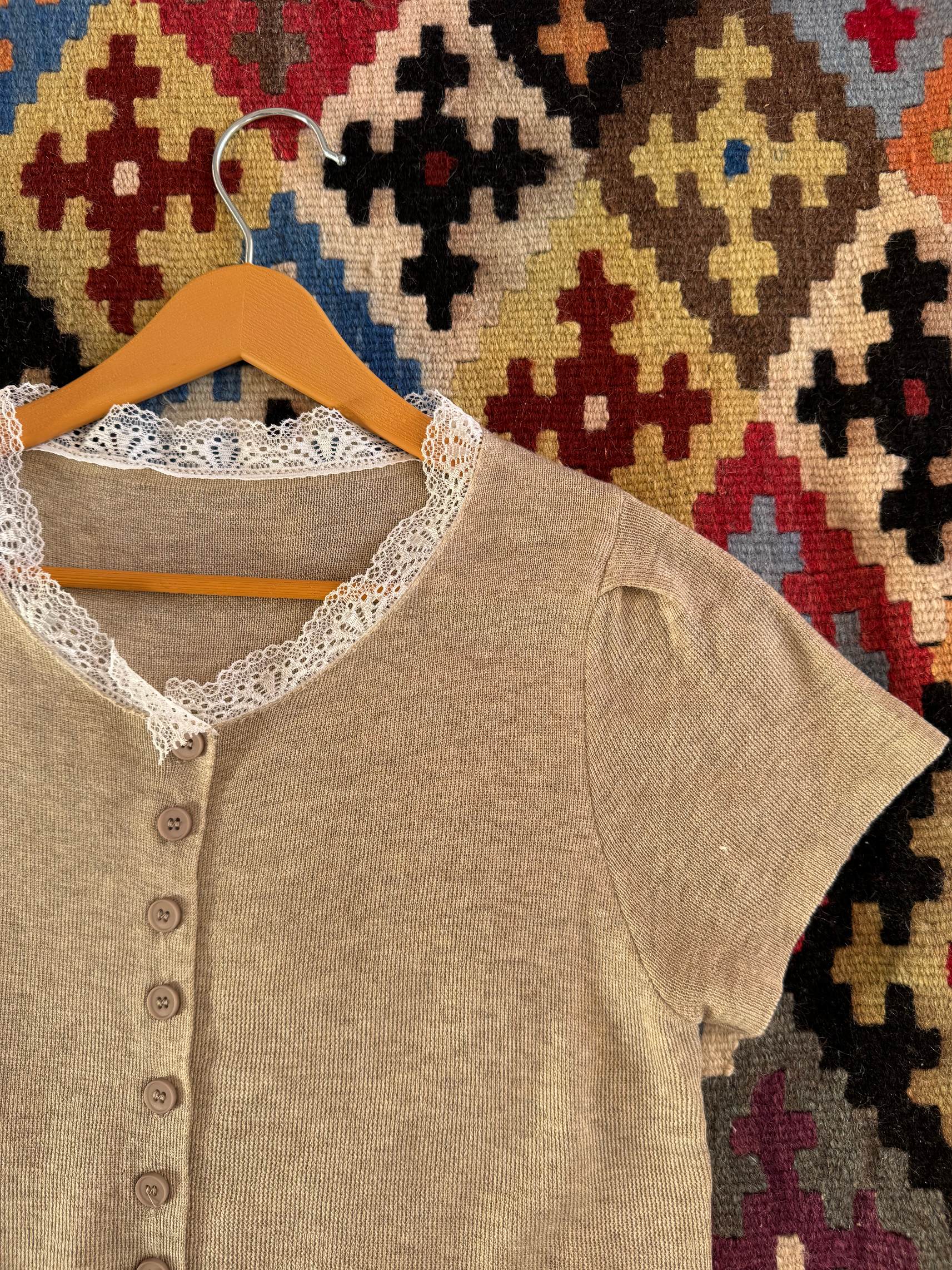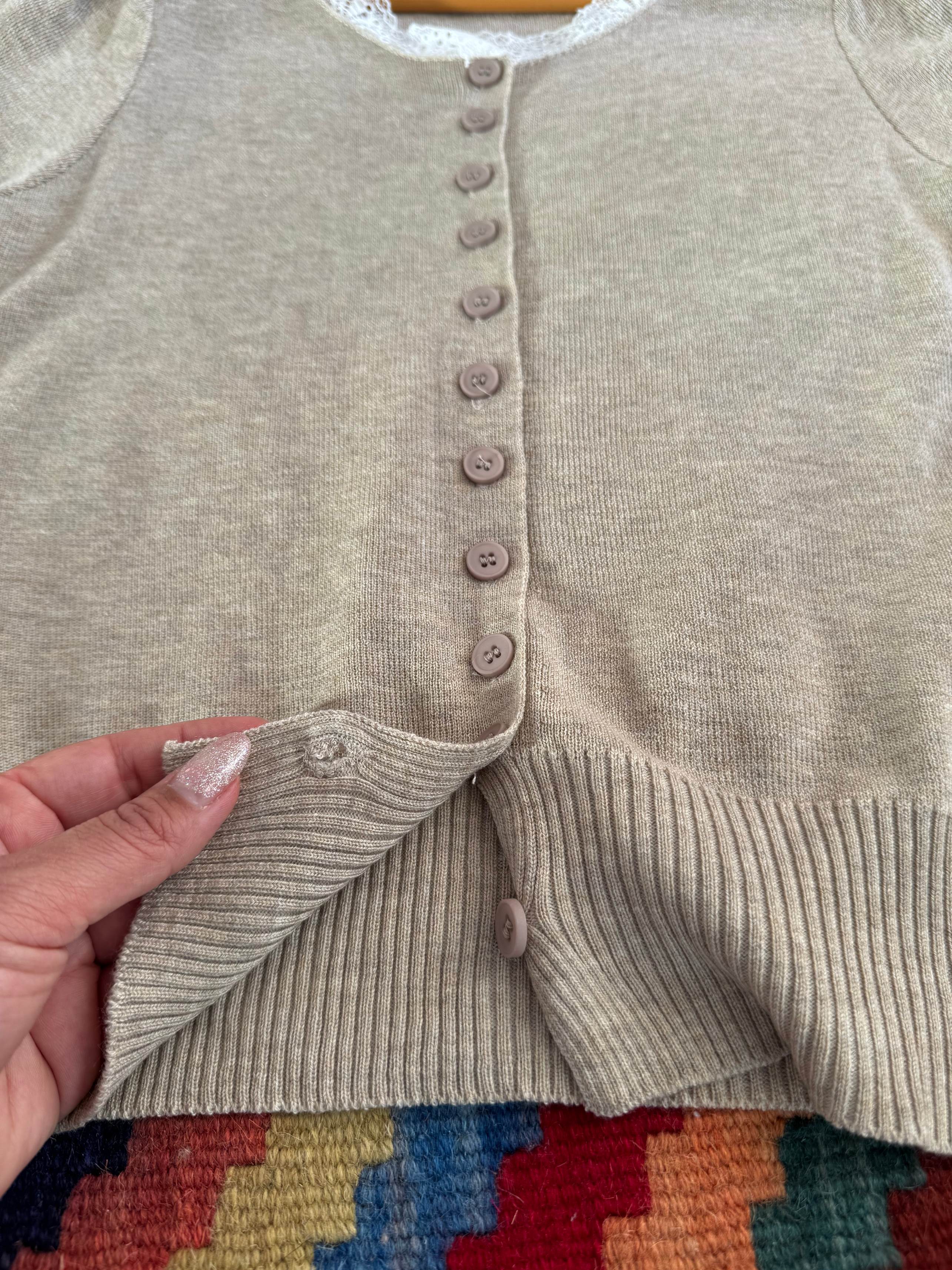 تیشرت بافت دخترانه و زنانه مدل جلو دکمه جنس کار بافت ظریف کریستال جنسش خیلی لطیف و نرمه دکمه ها باز میشن دور یقه دانتل ظریف کار شده فری سایزه و کشسانی خوبی داره فاصله دو زیر بغل ۴۹ بلندی ۵۱
