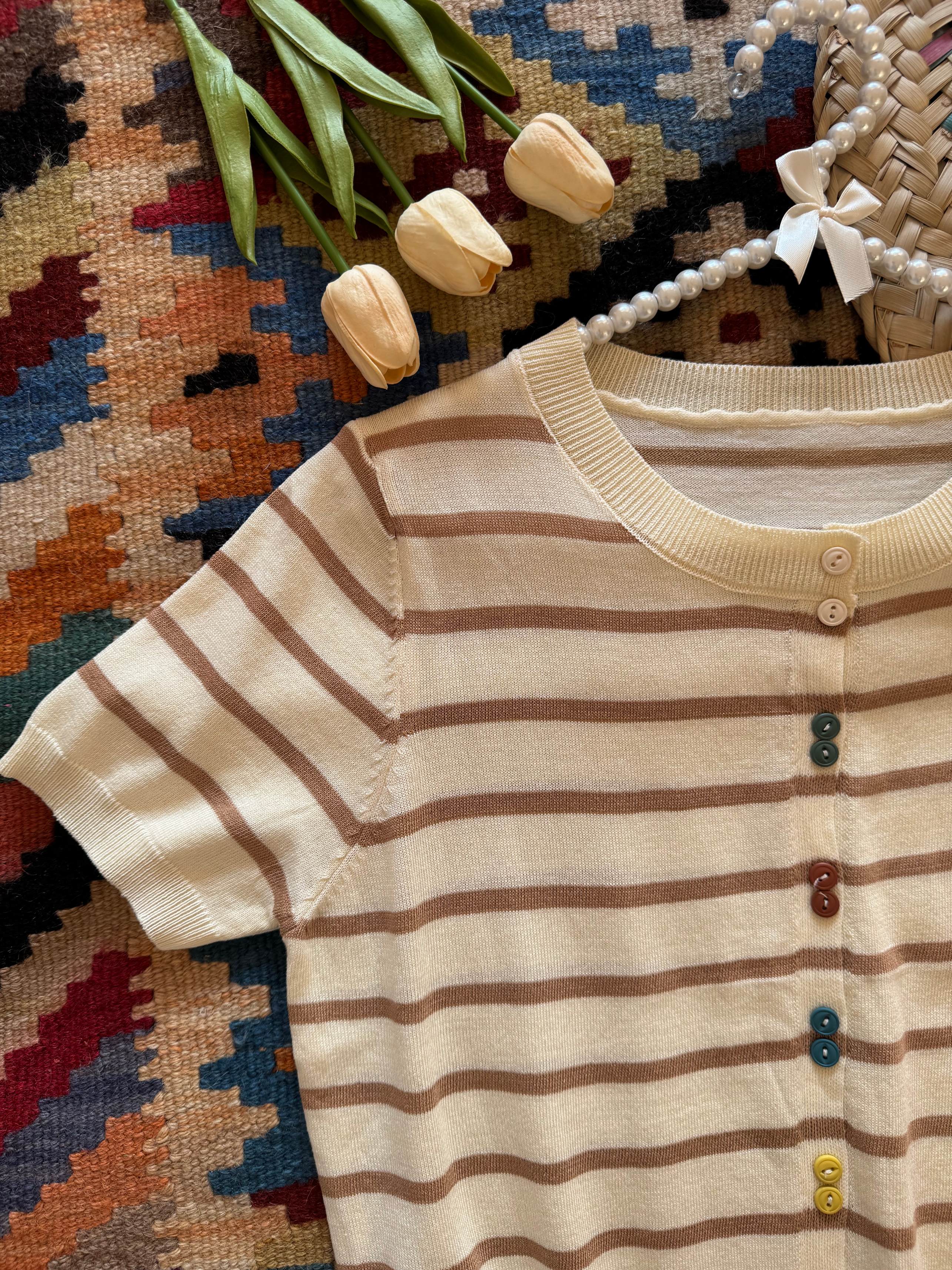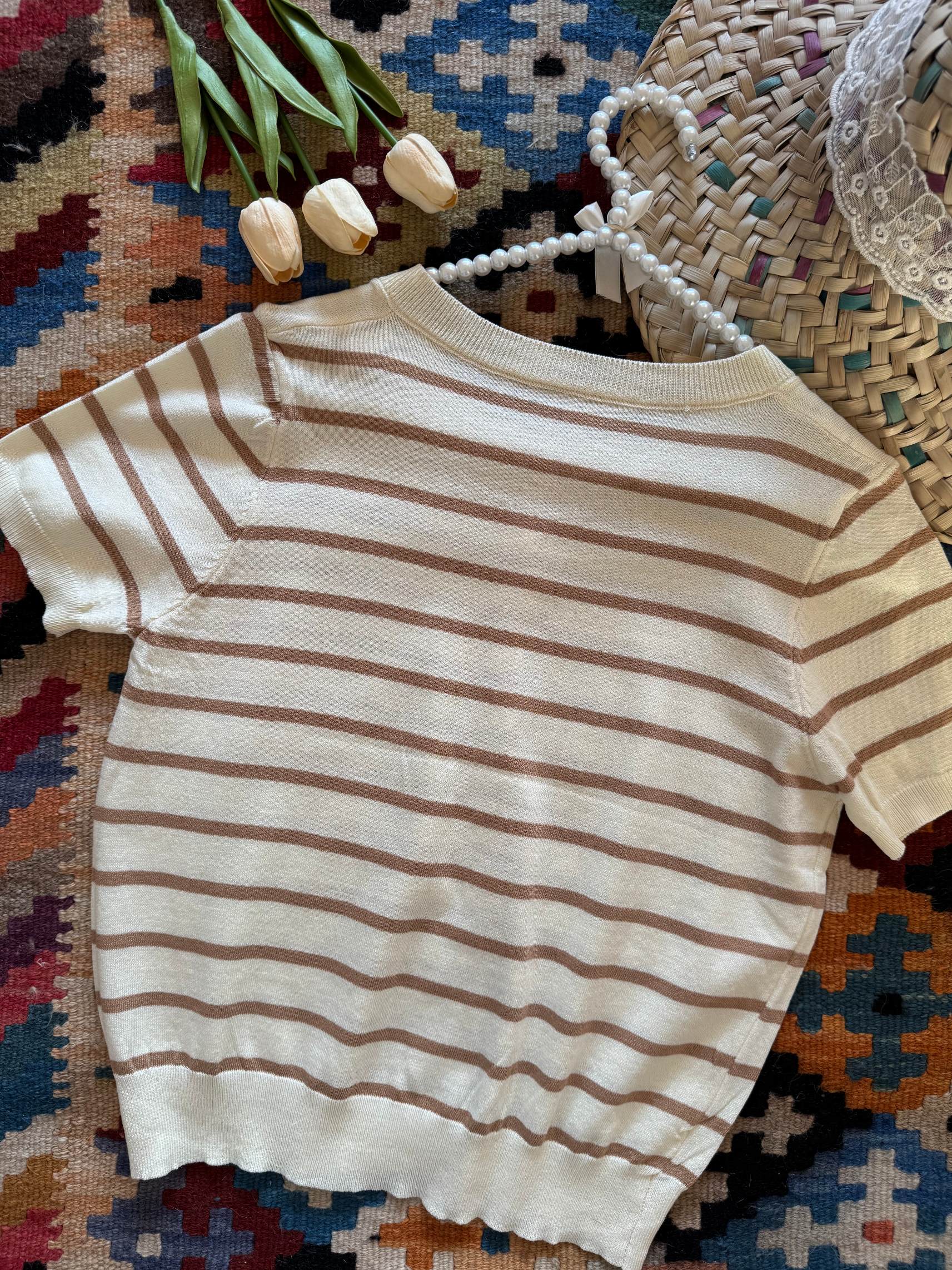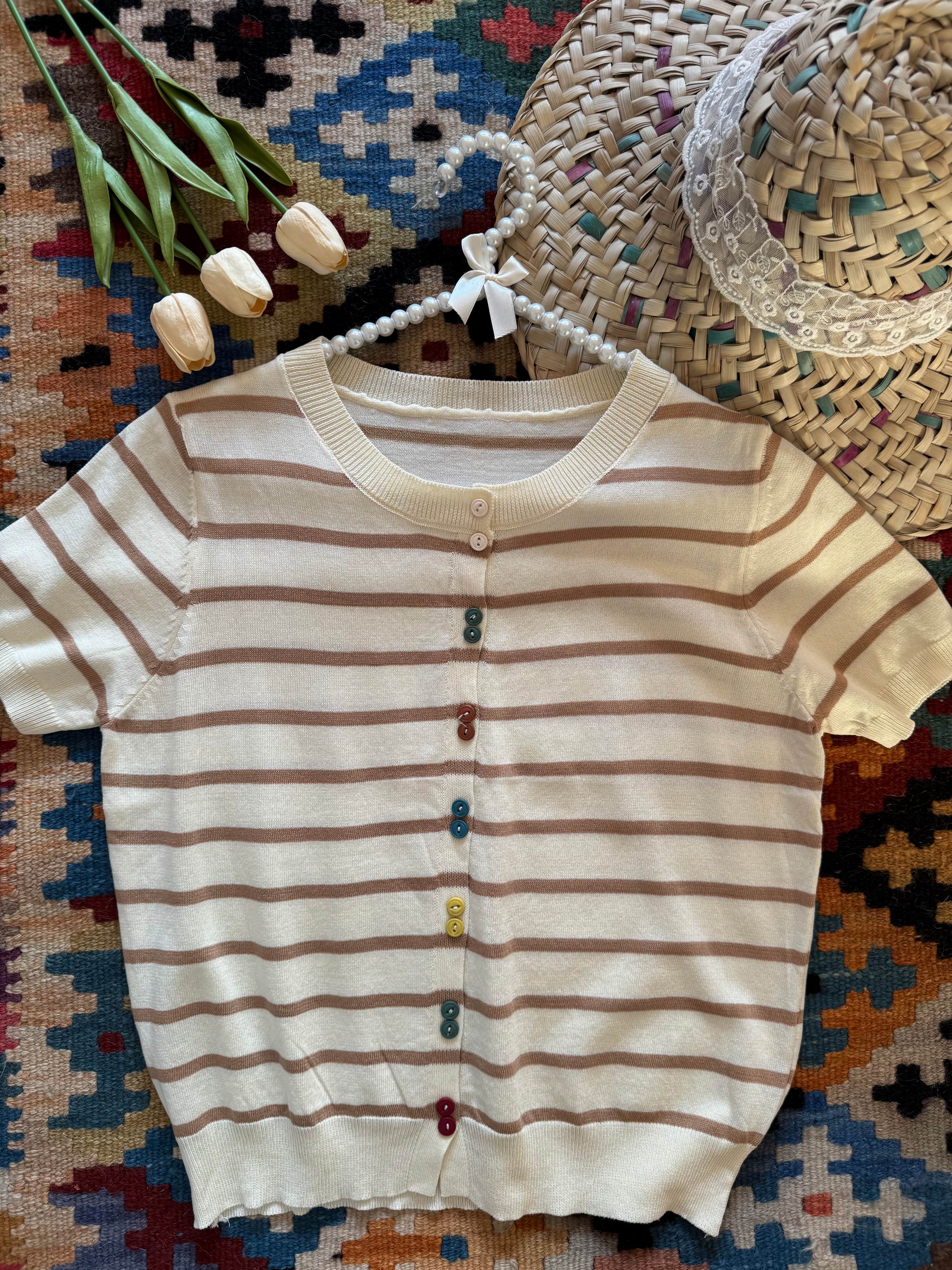 تیشرت بافت راه راه جنس کار بافت کریستال ظریف دکمه ها باز میشن فری سایز همراه با کشسانی بالا تک رنگ فاصله دو زیر بغل ۵۲ بلندی ۵۴