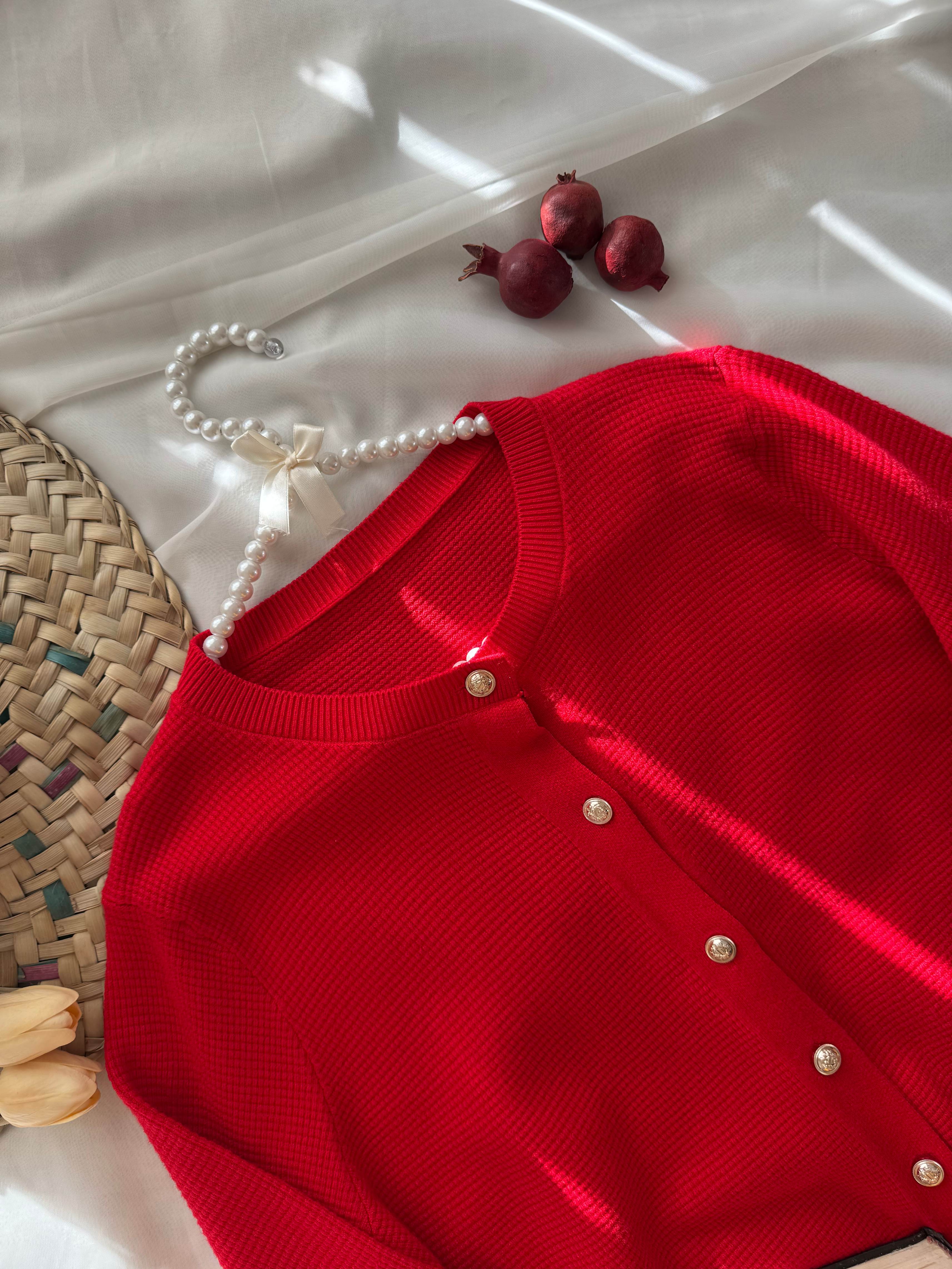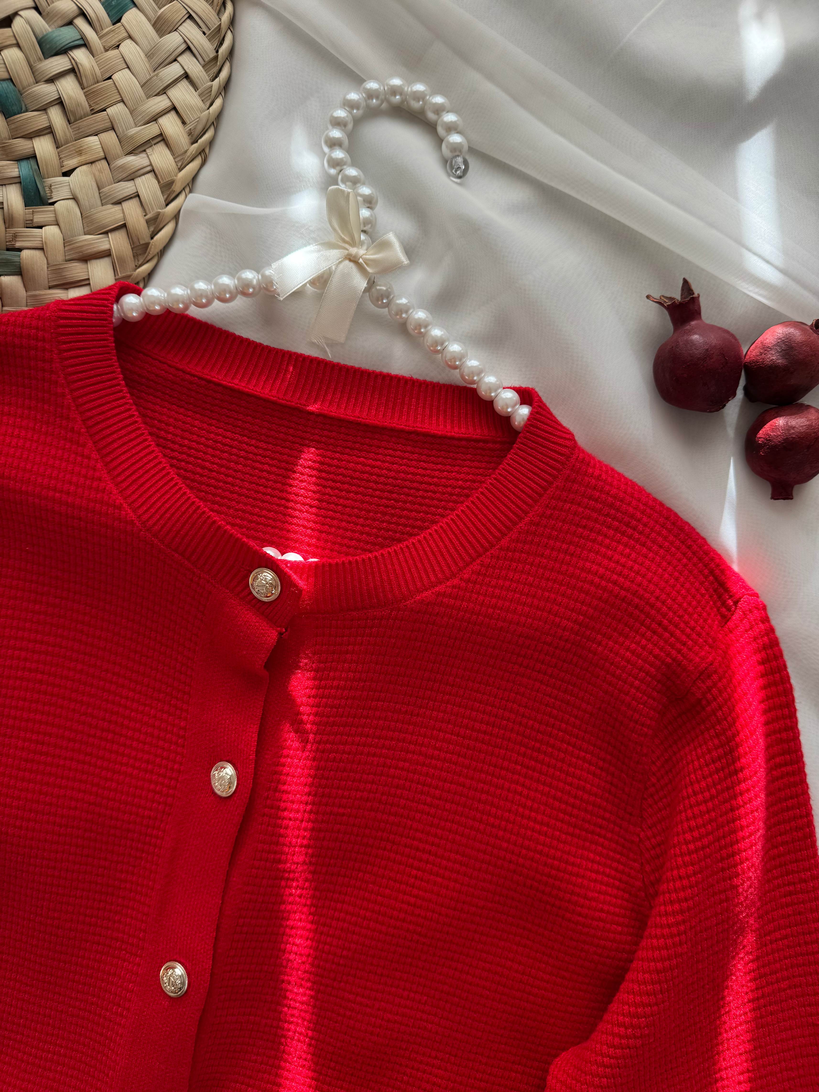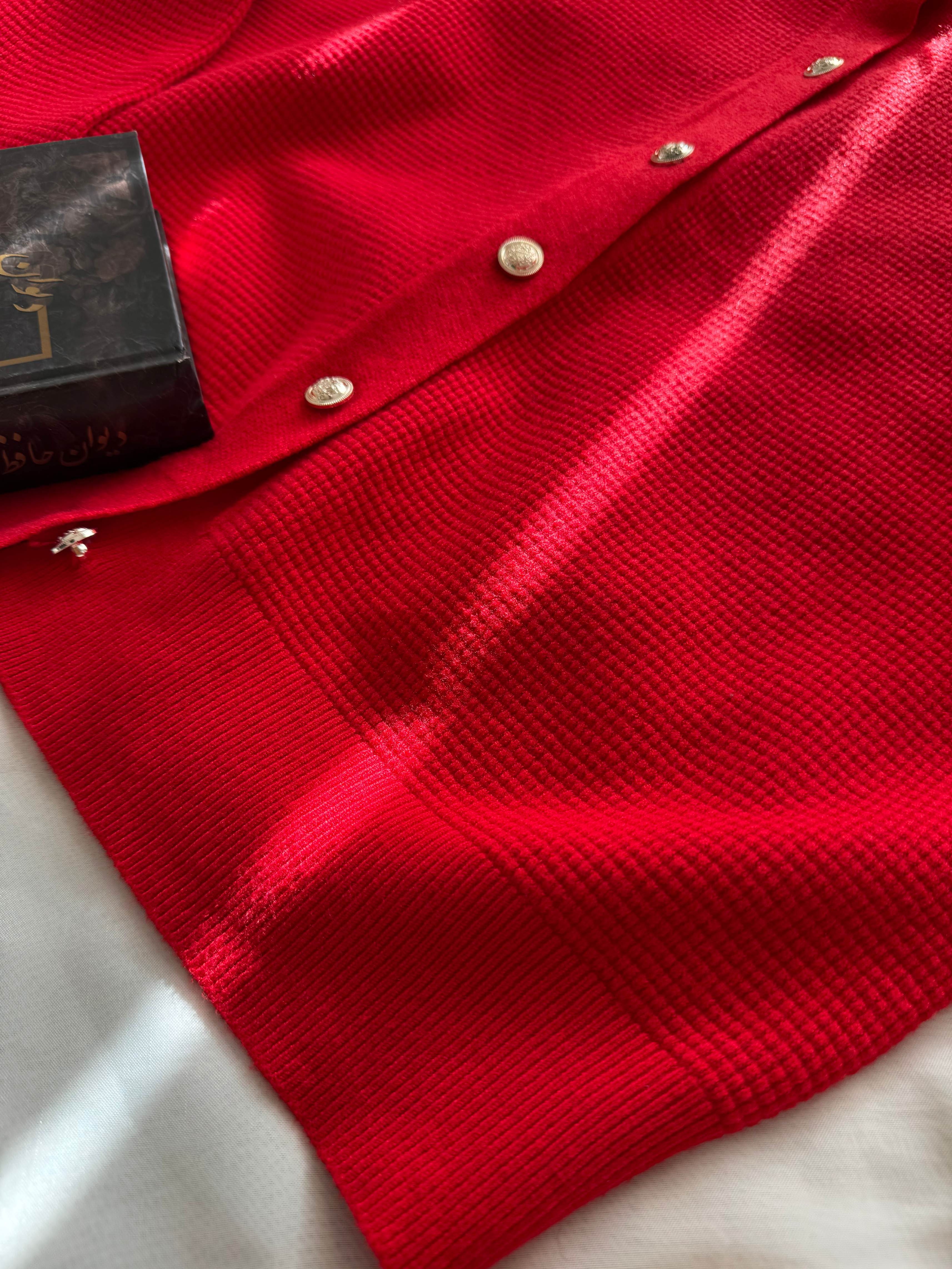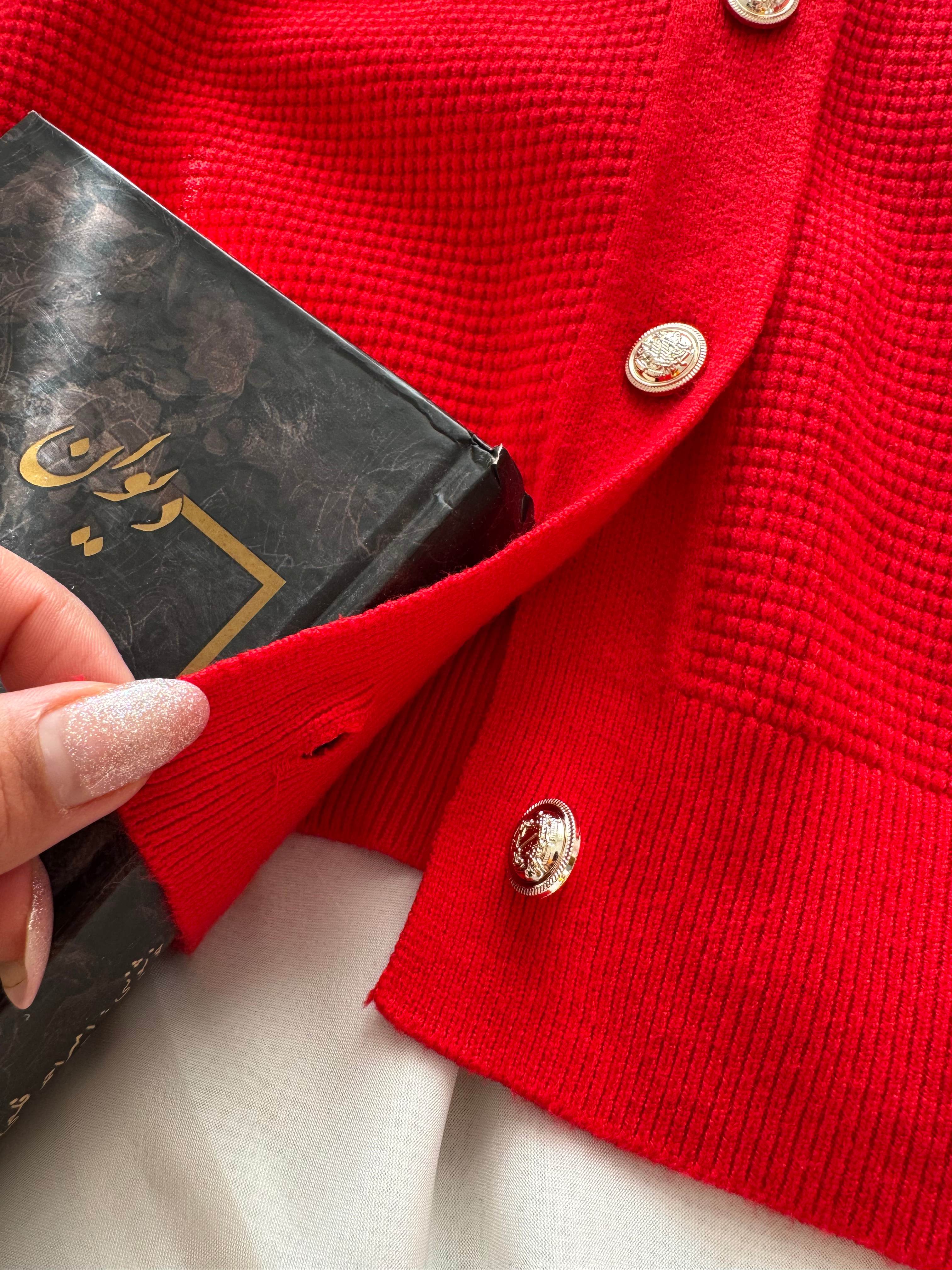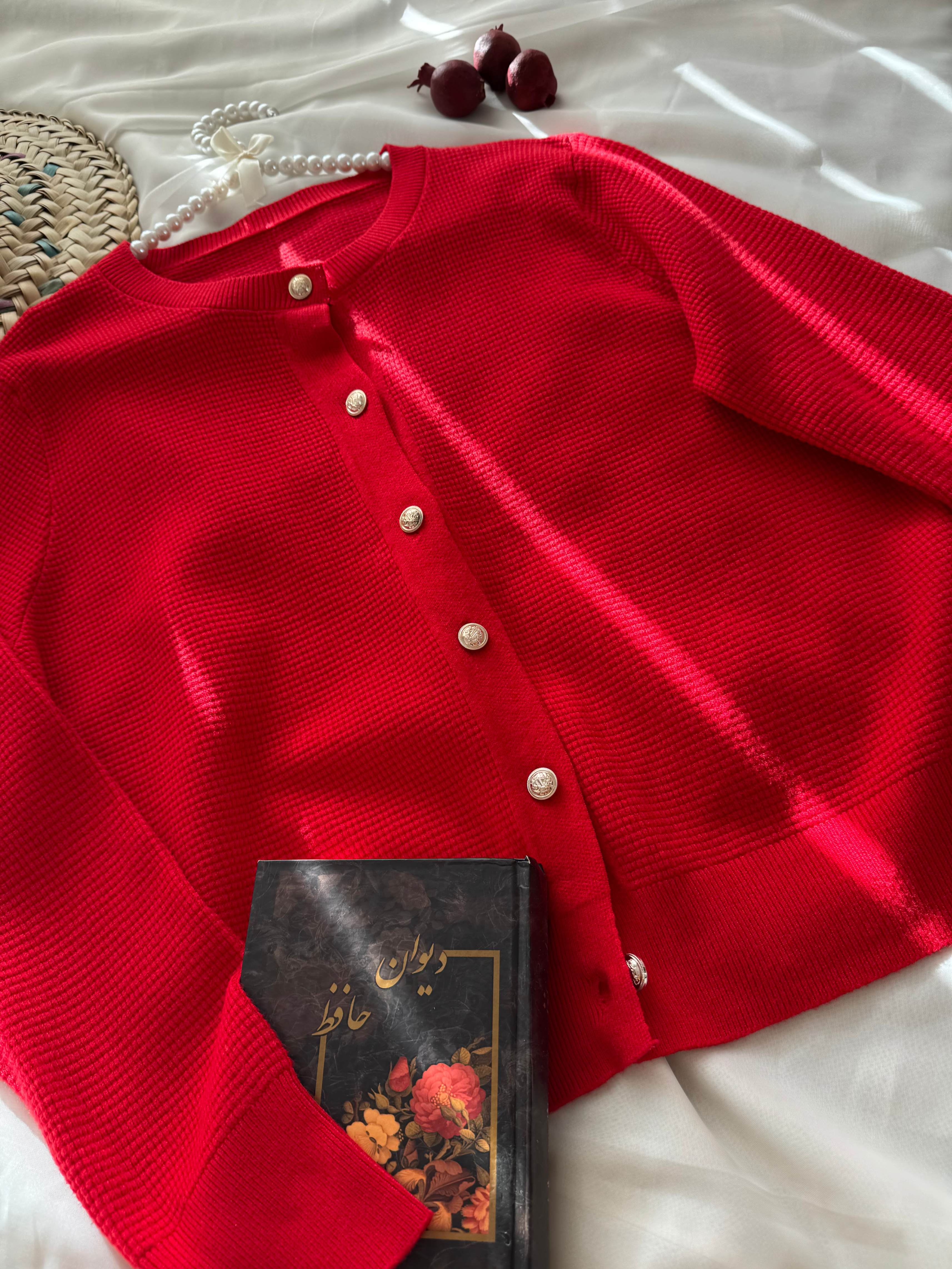 ژاکت بافت یلدا جنس بافت بیسکویتی درجه یک بسیار با کیفیت و گرم بالا دکمه های طلایی باز میشن در عین سادگی بسیار شیک و موقره فری سایز و تک رنگ فاصله دو زیر بغل ۵۷ بلندی ۵۸