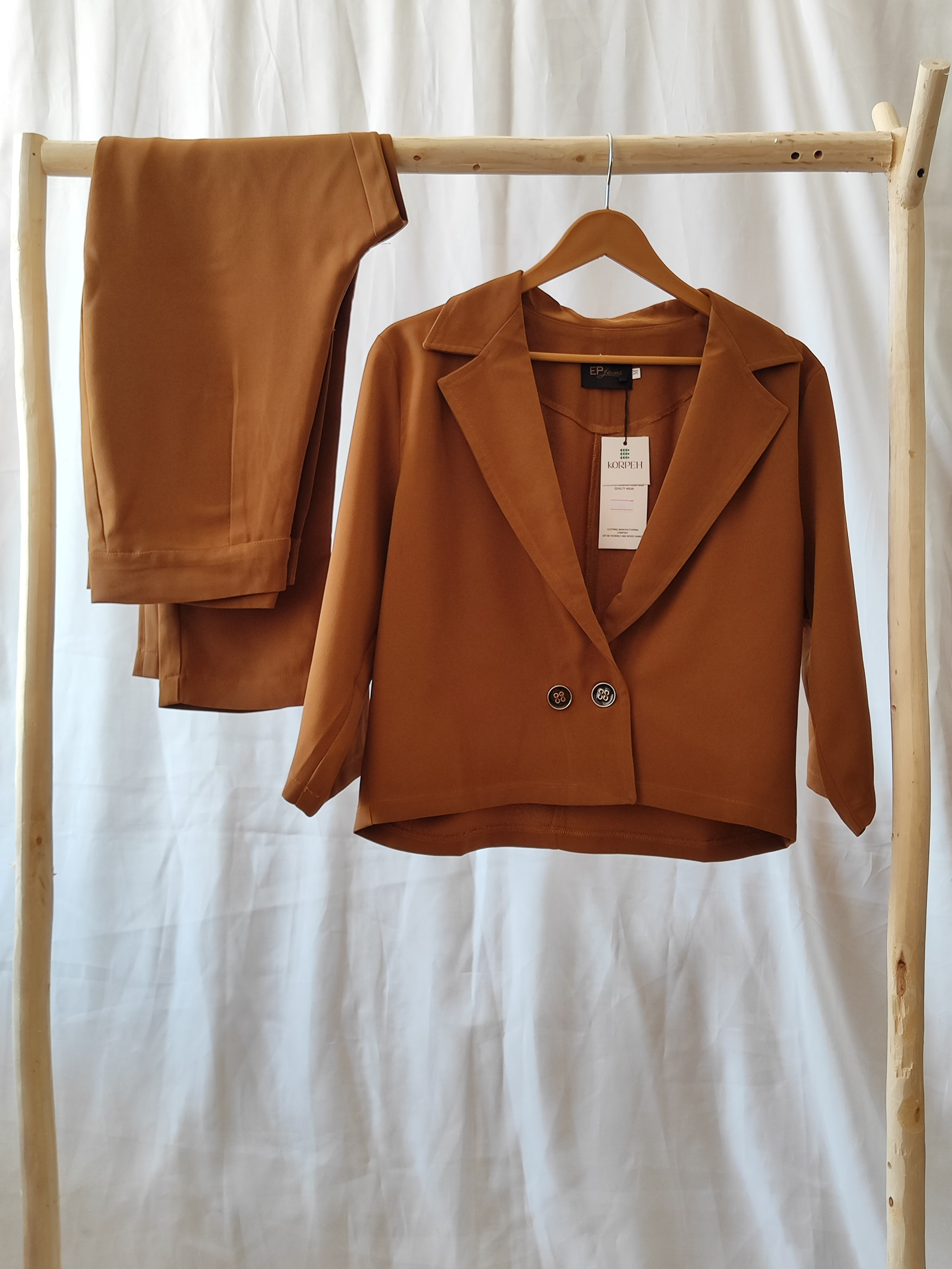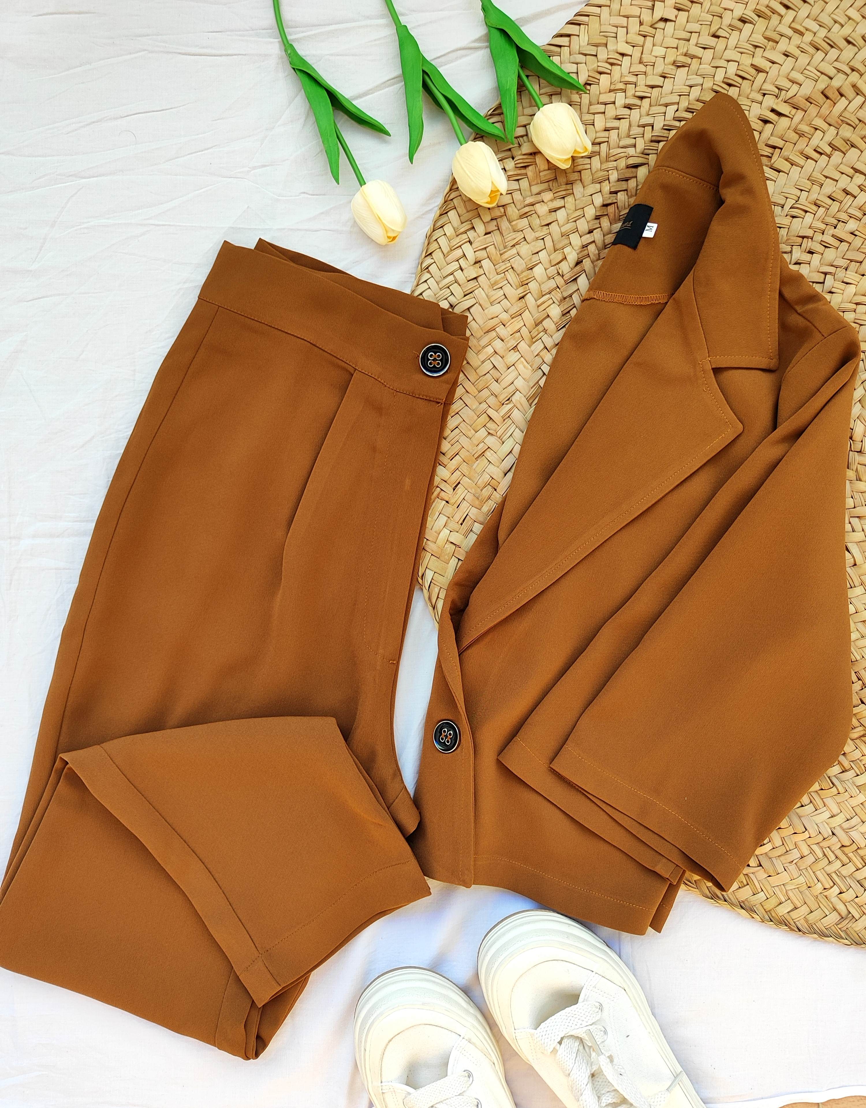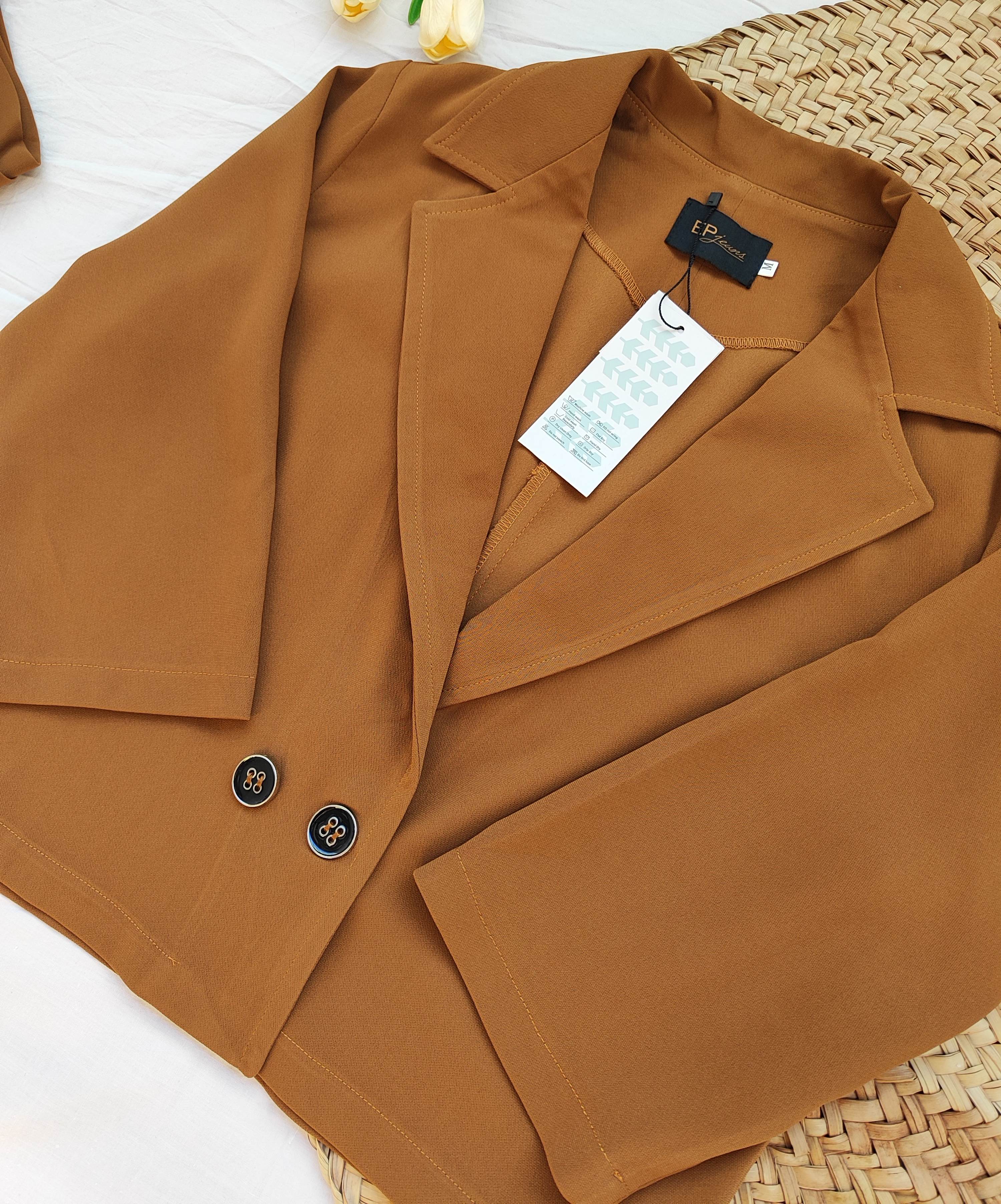 ست کراپ کت و شلوار جنس کار کرپ منسجم و احار دار بسیار خوش دوخت و خوش پوش تک رنگ قهوه ای سایز L فاصله دو زیر بغل کت ۵۵ بلندی ۵۱ دور کمر شلوار ۸۶ بلندی ۱۰۱