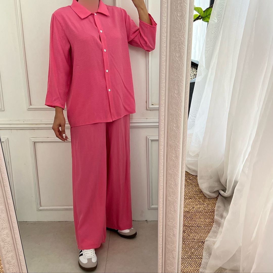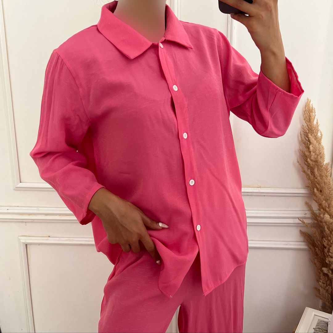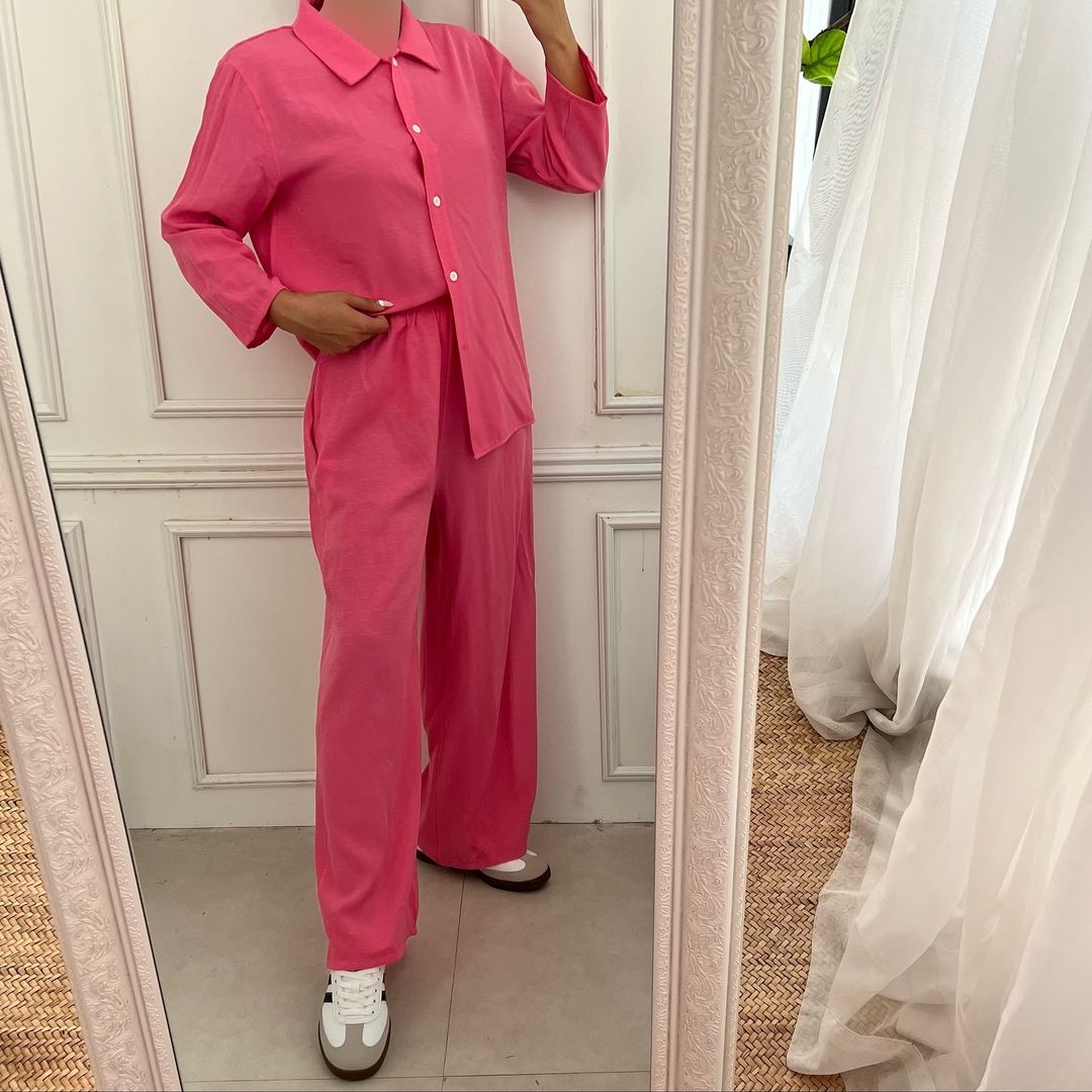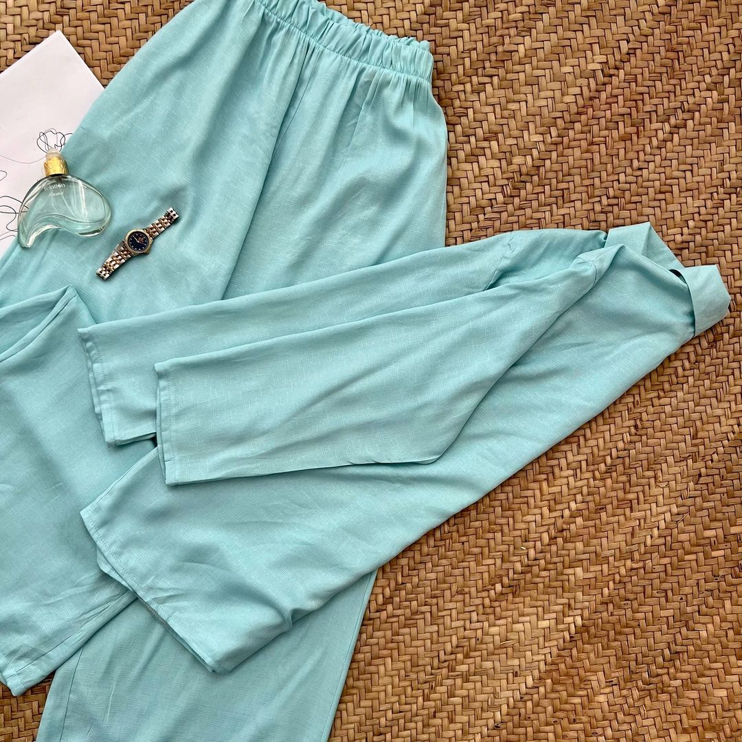 ست شومیز و شلوار لینن شومیز جلو دکمه کمر شلوار کش جیب داره خنک و مناسب فصل گرما تک سایز فاصله دو زیر بغل ۶۴ بلندی ۷۲ دور کمر شلوار ۹۰ بلندی شلوار ۱۰۴